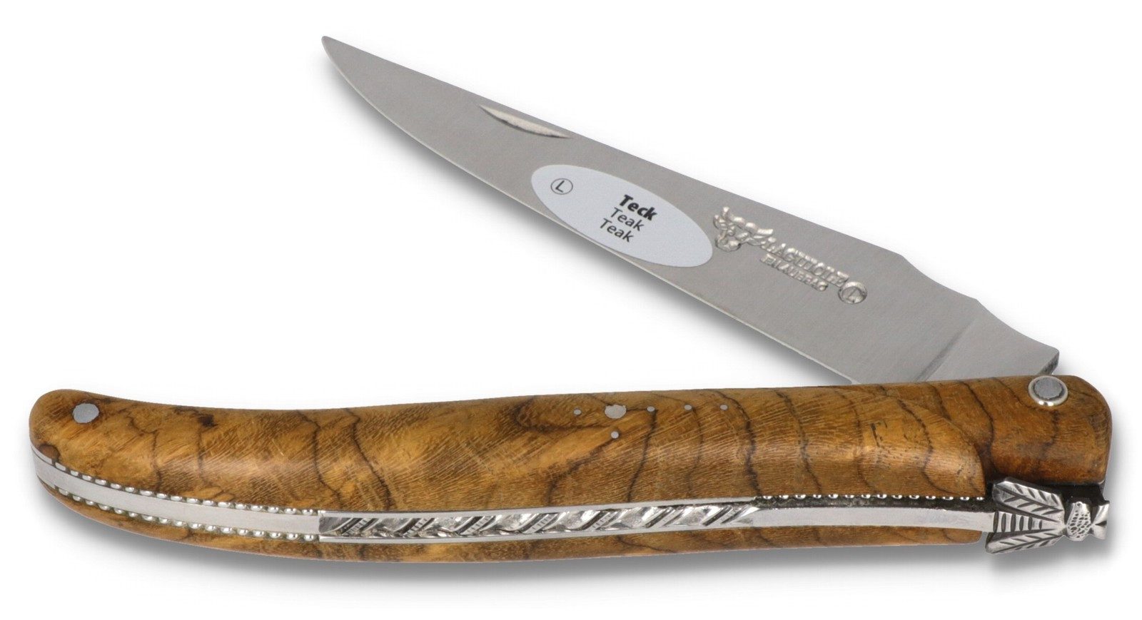 Die massiven, durchgängigen Griffschalen dieses 12 cm Modells sind aus schön gezeichnetem Teakholz.