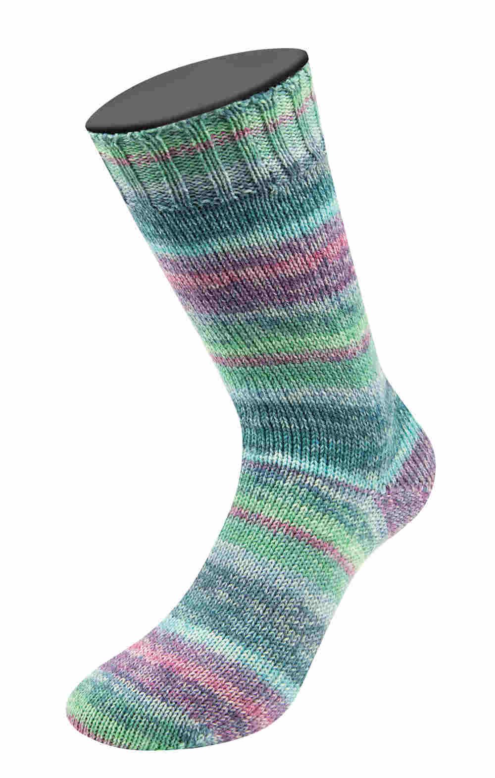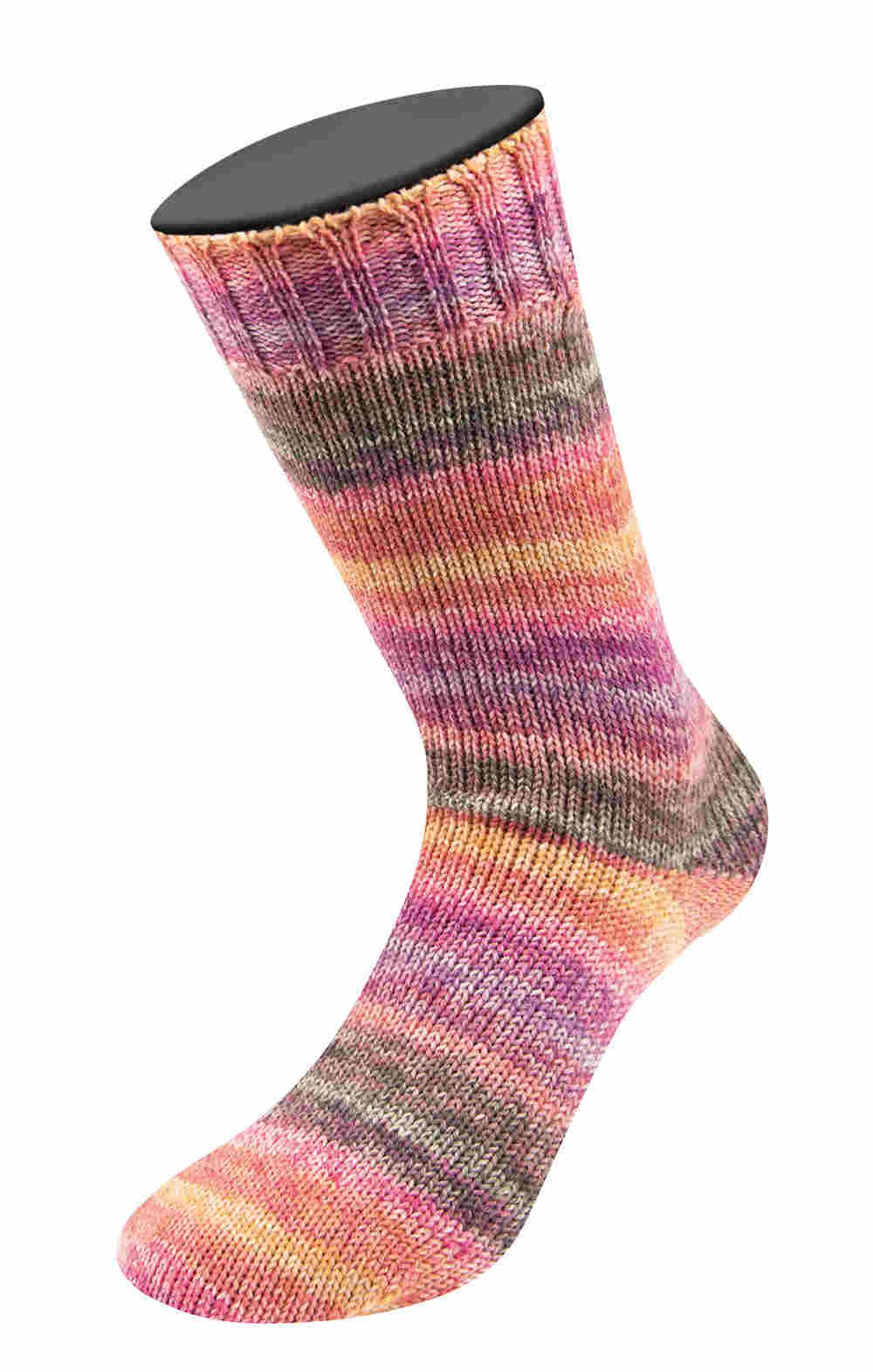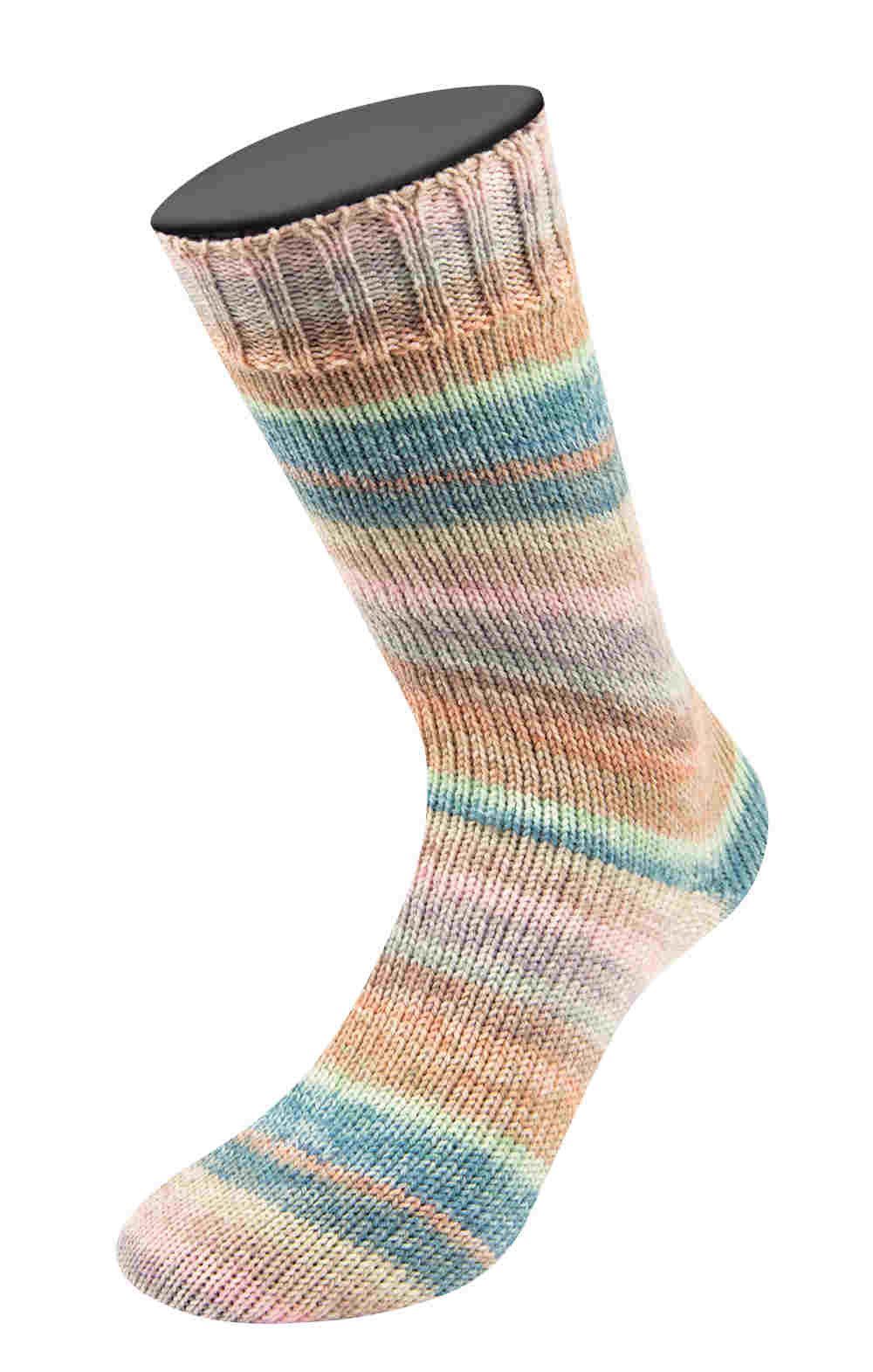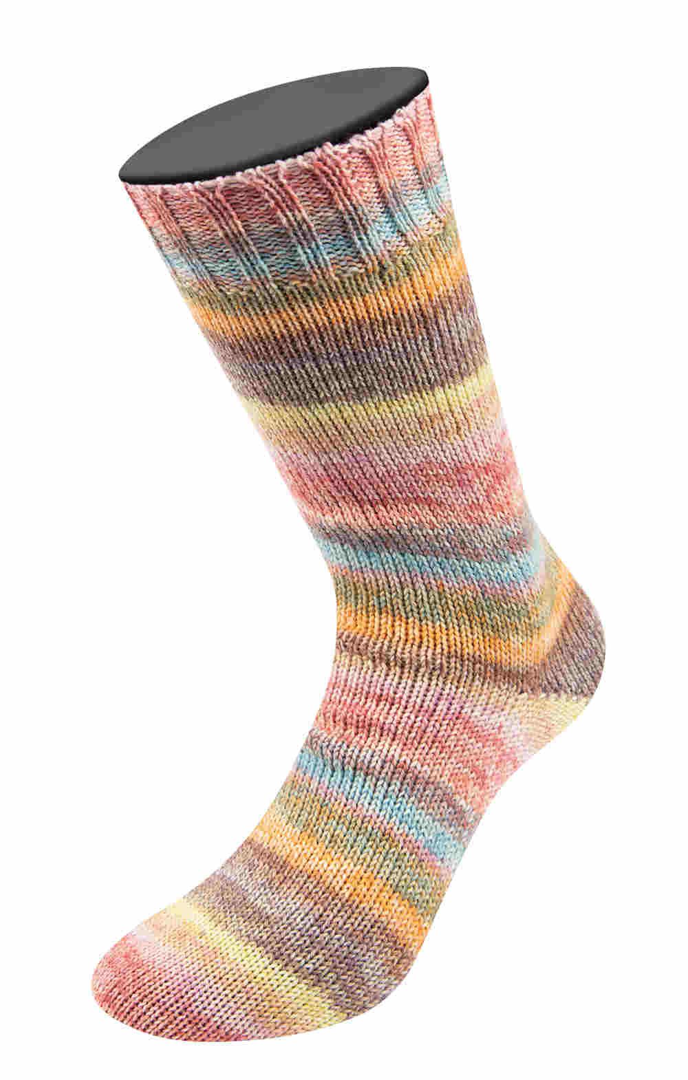 Die Meilenweit 100 Cashmere Hawaii von LANA GROSSA ist eine mehrfarbige Sockenwolle mit Kaschmiranteil. Sie besteht aus 70 % Schurwolle, 25 % Polyamid und 5 % Kaschmir. Das Garn zeichnet sich durch seine wärmeregulierenden und atmungsaktiven Eigenschaften aus und ist sehr weich und damit auch für empfindliche Füßchen geeignet. Die Fasern sind formstabil und halten das Projekt in Form. Durch die glatte Oberfläche bilden sich weniger Knötchen.