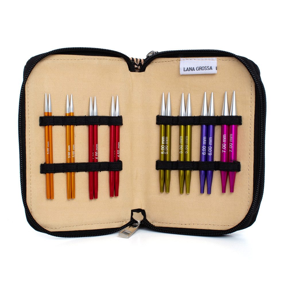 Mit dem Lana Grossa Nadel-Set (kurz) Aluminium Rainbow bist du bestens ausgestattet! Die hochwertigen, farbigen Aluminium-Nadeln liegen angenehm in der Hand und sorgen für ein müheloses Strickerlebnis. Dank der drehbaren Nadelseile kannst du flexibel verschiedene Gesamtlängen erstellen. Das kompakte Etui mit Reißverschluss hält alles ordentlich beisammen – ideal für unterwegs!