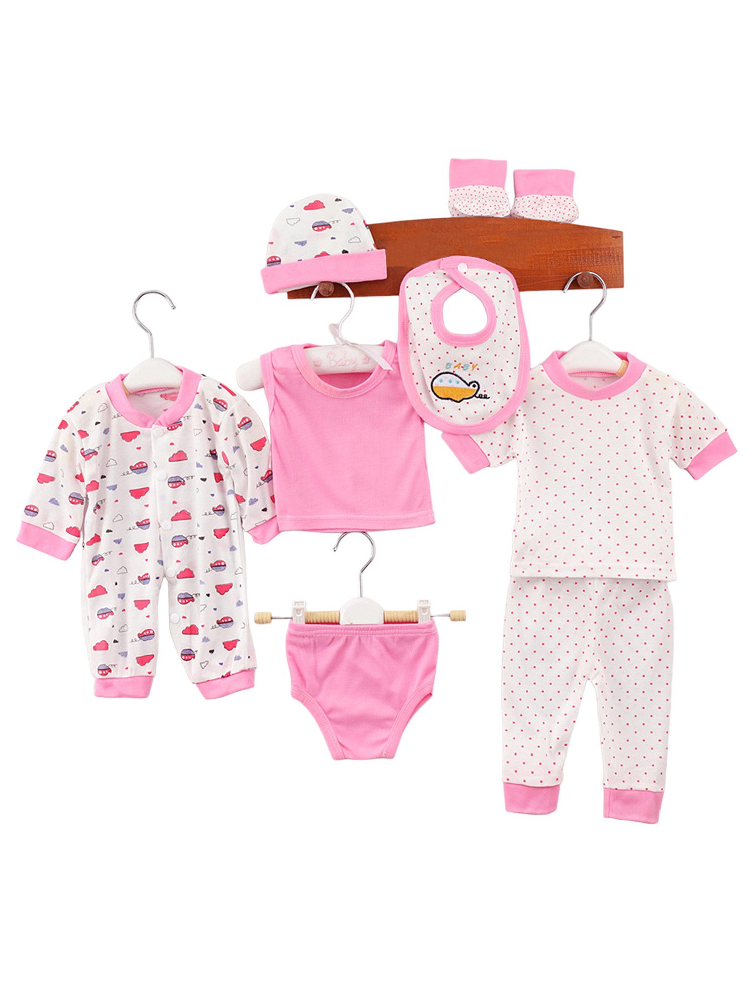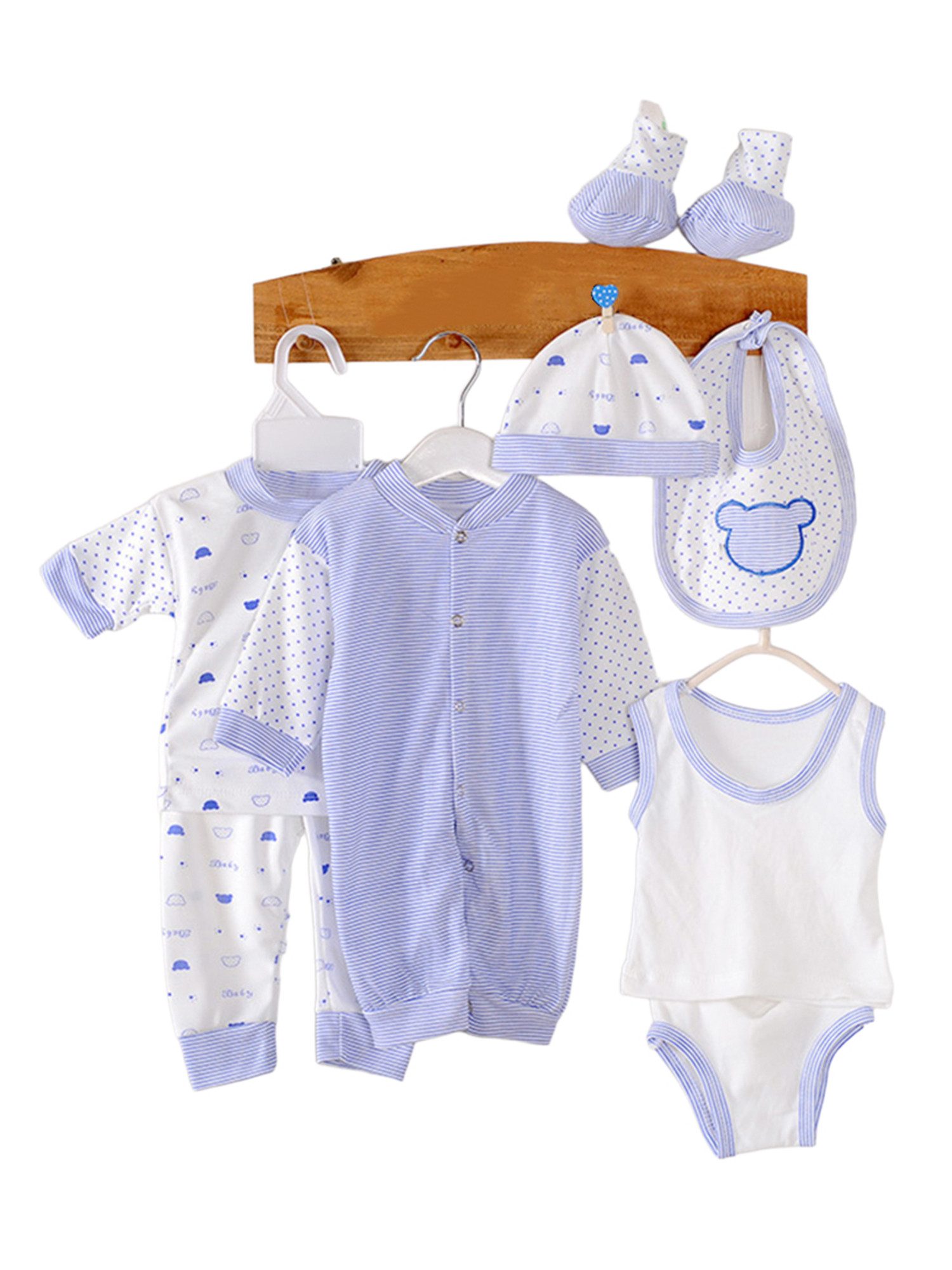 Die Set bestehen aus verschiedenen Elementen, Tupfen, Streifen, Cartoon-Drucken und mehr, jedes ist etwas Besonderes. Das mehrteilige Set erfüllt die täglichen Kleidungsbedürfnisse von Neugeborenen mit einem niedlichen, einfachen Stil, der perfekt für die Kleinen ist. Die Sets sind mit Bedacht in Frühlings-, Sommer- und Herbstmodellen erhältlich, und jede Kombination ist fein geschnitten, um den Komfort Ihres Babys zu gewährleisten.