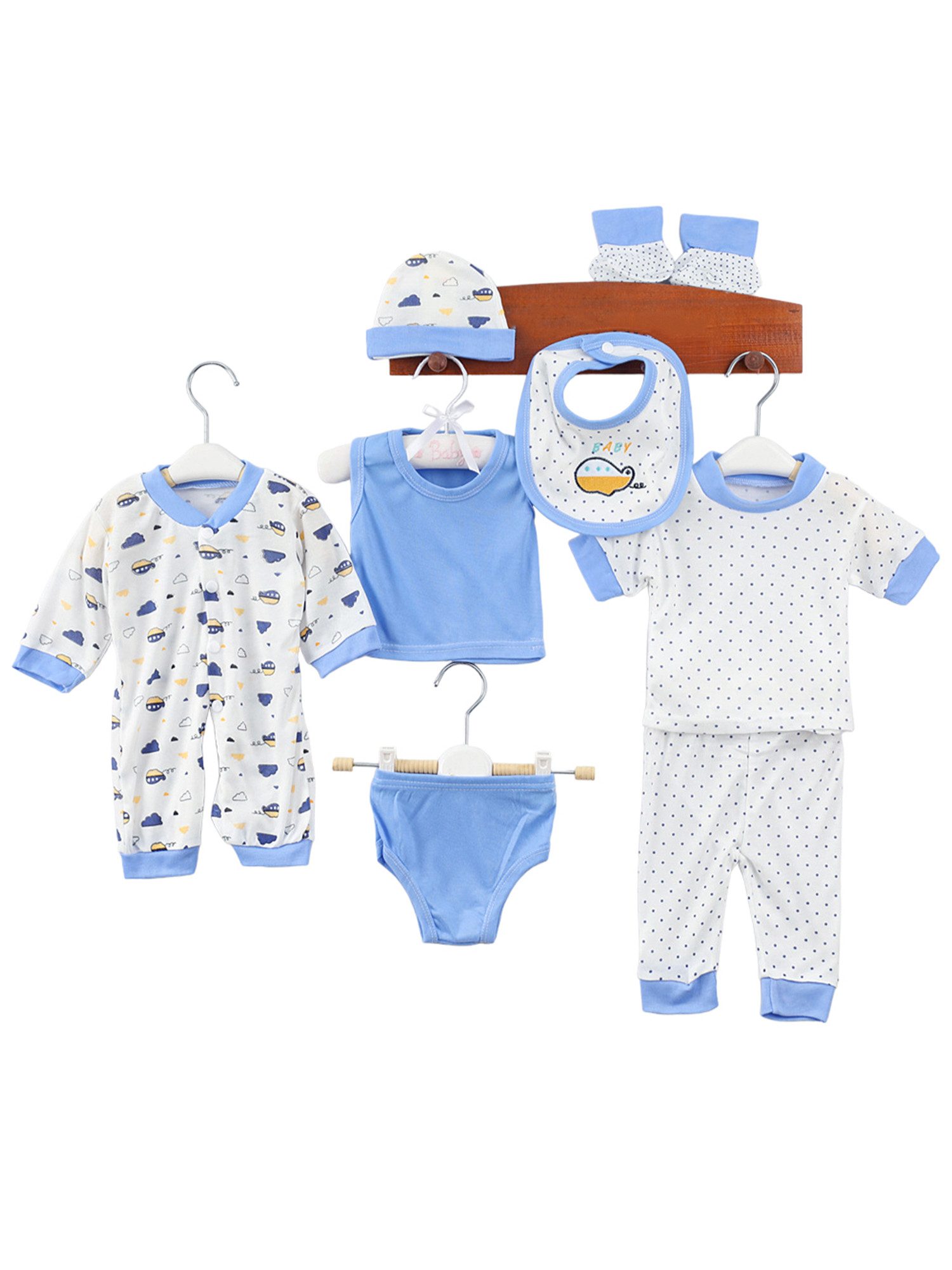 Das Set besteht aus 8 Teilen: einem langärmeligen Strampler, einem ärmellosen Oberteil und einer Dreiecksshorts, einem kurzärmeligen Oberteil und einer Hose, einem Paar Socken, einem Hut und einem Lätzchen.