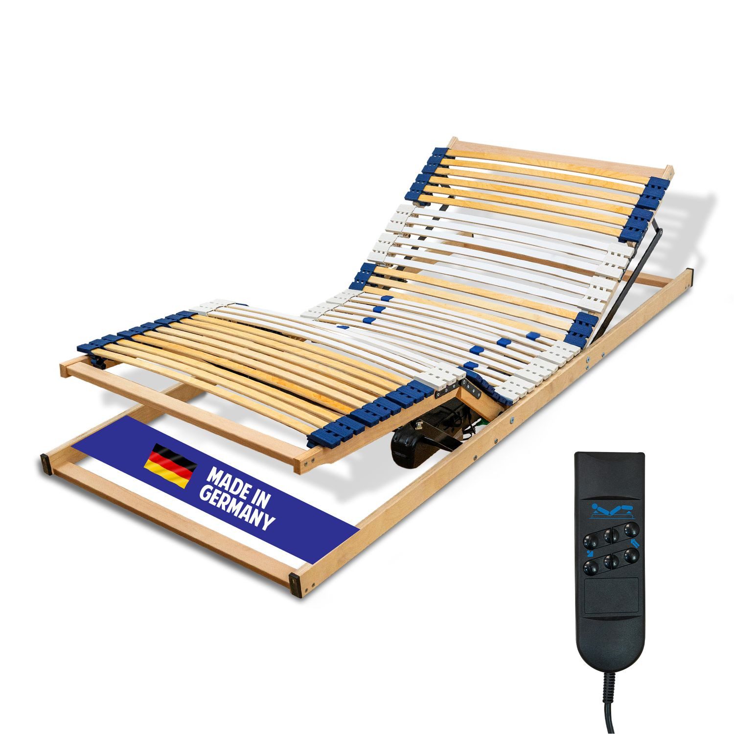Den größten Nutzen werden Sie jedoch von den beiden leistungsfähigen Motoren haben. Sie sind mit einer Netzfreischaltung und Notabsenkung ausgestattet. Somit wird nur minimal Strom verbraucht und bei Stromausfall wird ein hochgeklappter Lattenrost wieder Not-abgesenkt. Die Höhe des stabilen Schichtholzrahmens inklusive der Federholzleisten beträgt ca. 9 cm. Für den Motor und das Gestänge wird ca. 13 cm Freiraum unter dem Lattenrost benötigt. Der Lattenrahmen wird fertig montiert geliefert, kein Bausatz!