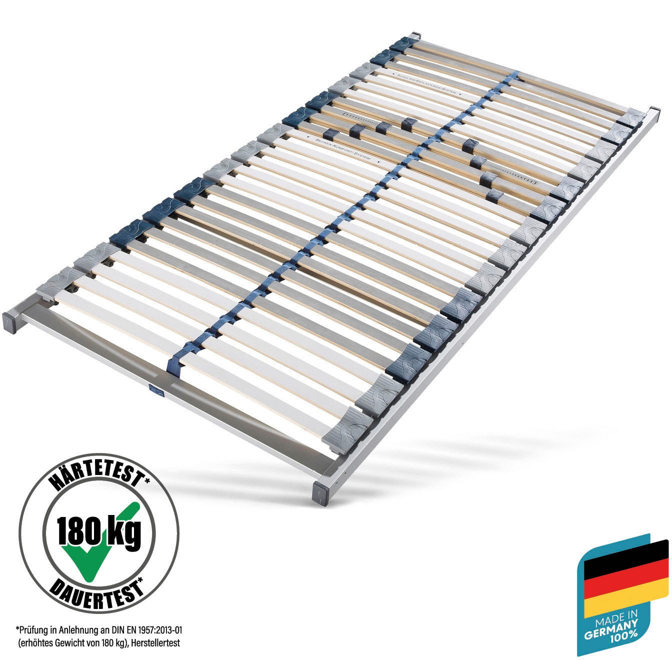 Besondere Hinweise | Für die Kompatibilität mit handelsüblichen Bettgestellen werden Lattenroste knapp unterhalb der gängigen Bettenmaße gefertigt. Die Lattenroste werden entsprechend der Norm DIN EN 1725:1998-2 gefertigt. Beispiel: Bettenmaß ca. 90x200 cm = Rahmenmaß ca. 89x196 cm. extra stabiler Lattenrost, ideal für Doppelbetten geeignet |