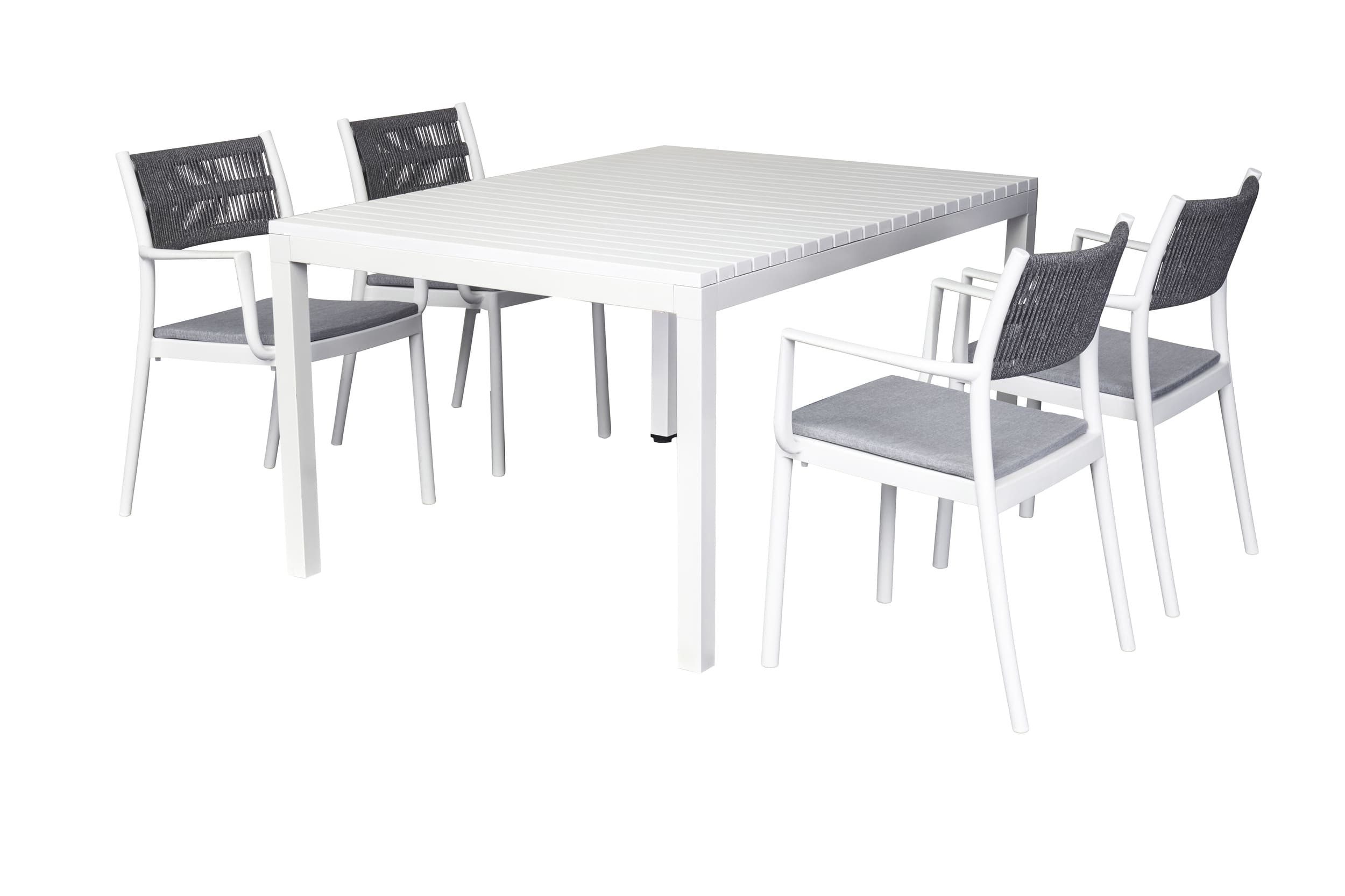 Der großzügige Tisch bietet Platz für gemütliche Mahlzeiten oder entspannte Nachmittage mit Freunden und Familie, während die ergonomischen Stühle mit bequemen Sitzpolstern maximalen Komfort garantieren. Das minimalistische Design in zeitlosem Weiß und Blau fügt sich harmonisch in jede Umgebung ein und verleiht Ihrem Outdoor-Bereich eine einladende Atmosphäre.