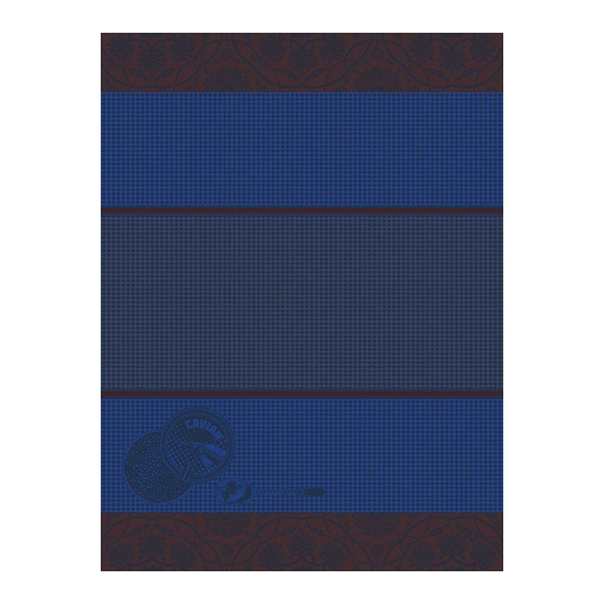 Pflegehinweise | MotivbeschreibungDieses Küchentuch besticht durch ein geometrisches Design mit horizontalen Streifen in verschiedenen Blautönen, die durch schmale, dunkelrote Linien getrennt sind. Am unteren Rand befinden sich zwei runde Embleme mit dem Schriftzug Caviar und einem stilisierten Globus, umrahmt von einem zarten, dunkelroten Blumenmuster. Die Farbpalette aus tiefem Blau und einem satten Rostrot verleiht dem Handtuch eine elegante und zugleich rustikale Ausstrahlung. |