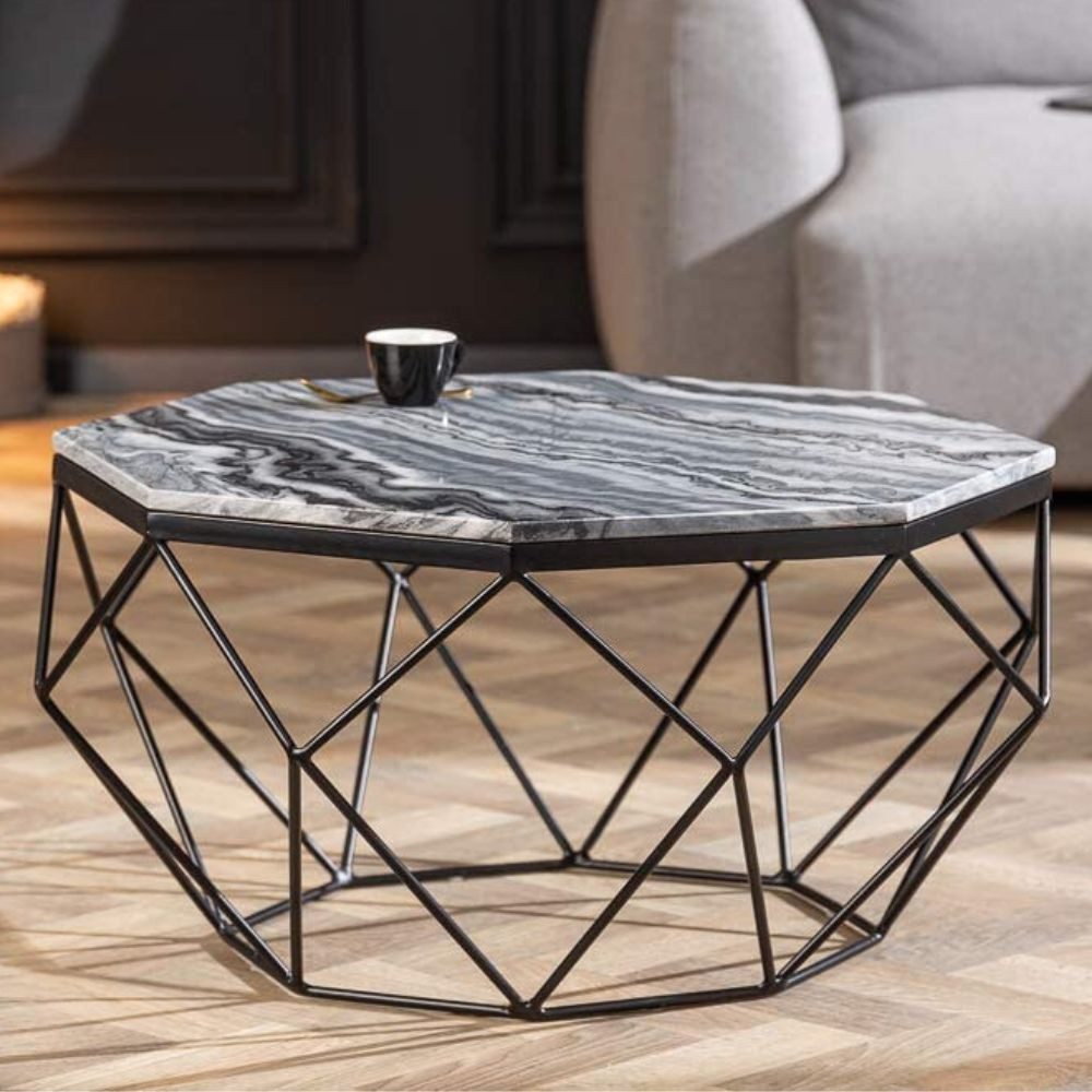 Glamouröser Wohnzimmertisch in einem außergewöhnlichem Design. Das offene Metallgestell in Messingfarbe kombiniert mit der handpolierten Marmorplatte sind ein wahrer Eyecatcher. Jede dieser Marmorplatten, mit ihren unterschiedlichen Nuancen, ist einzigartig und läßt sich vielleicht gerade deswegen, hervorragend mit vielen unterschiedlichsten Sofatypen kombinieren.