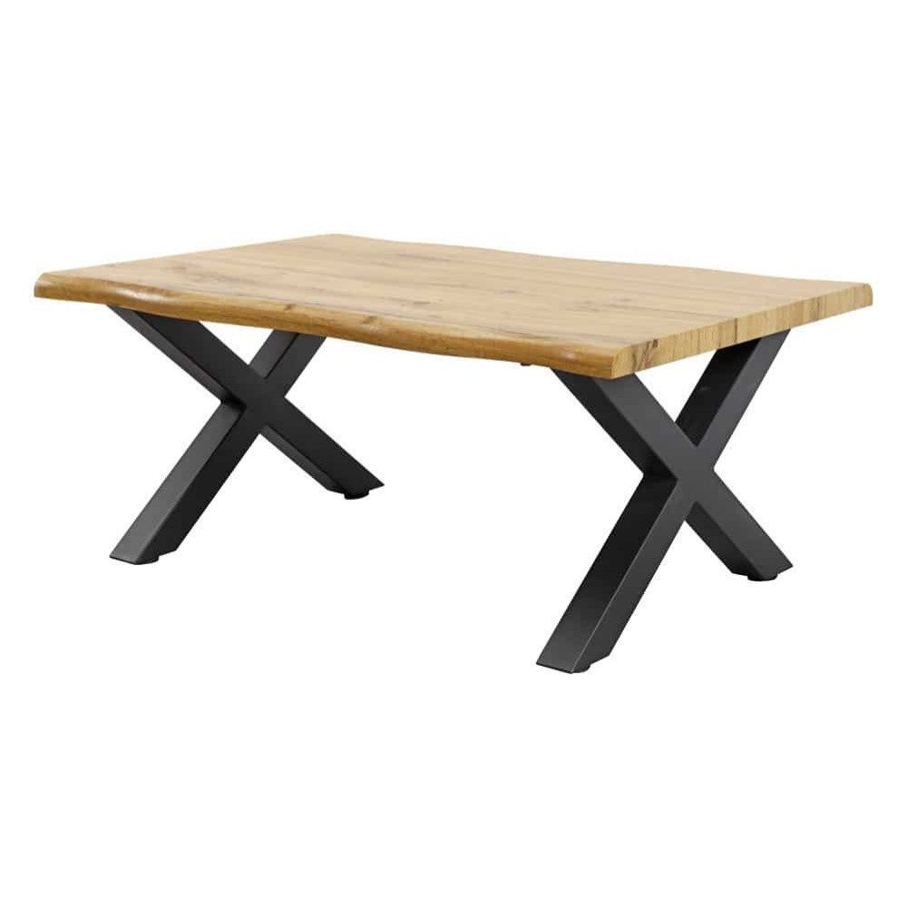 Das massive X-Gestell aus schwarzem Metall sorgt nicht nur für Stabilität, sondern setzt auch einen ausdrucksstarken Kontrast zur natürlichen Holzoptik. Es verleiht dem Tisch seinen unverwechselbaren Loft-Charakter und macht ihn zum perfekten Begleiter für moderne Wohnkonzepte im Industrial- oder Scandi-Stil.