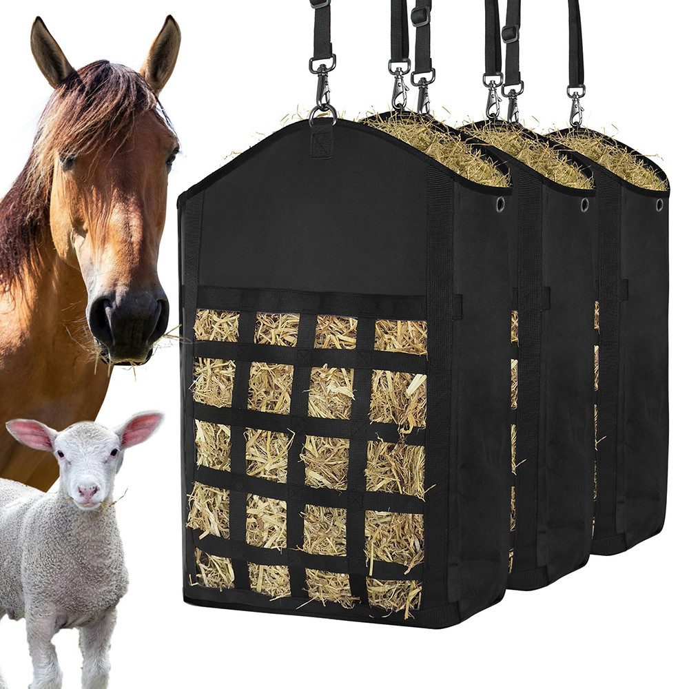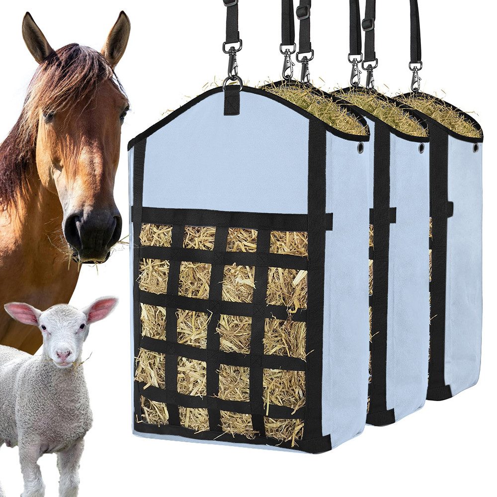 Vielseitige Anwendung: Die Heutasche kann drinnen oder draußen, an Bäumen, im Stall, am Zaun oder auf der Weide verwendet werden. Sie eignet sich perfekt als Futtertasche für Pferde, Esel, Rinder, Alpakas, Strauße oder andere Tiere – ideal zum sauberen, geschützten Lagern und Füttern von Heu, auch unterwegs.