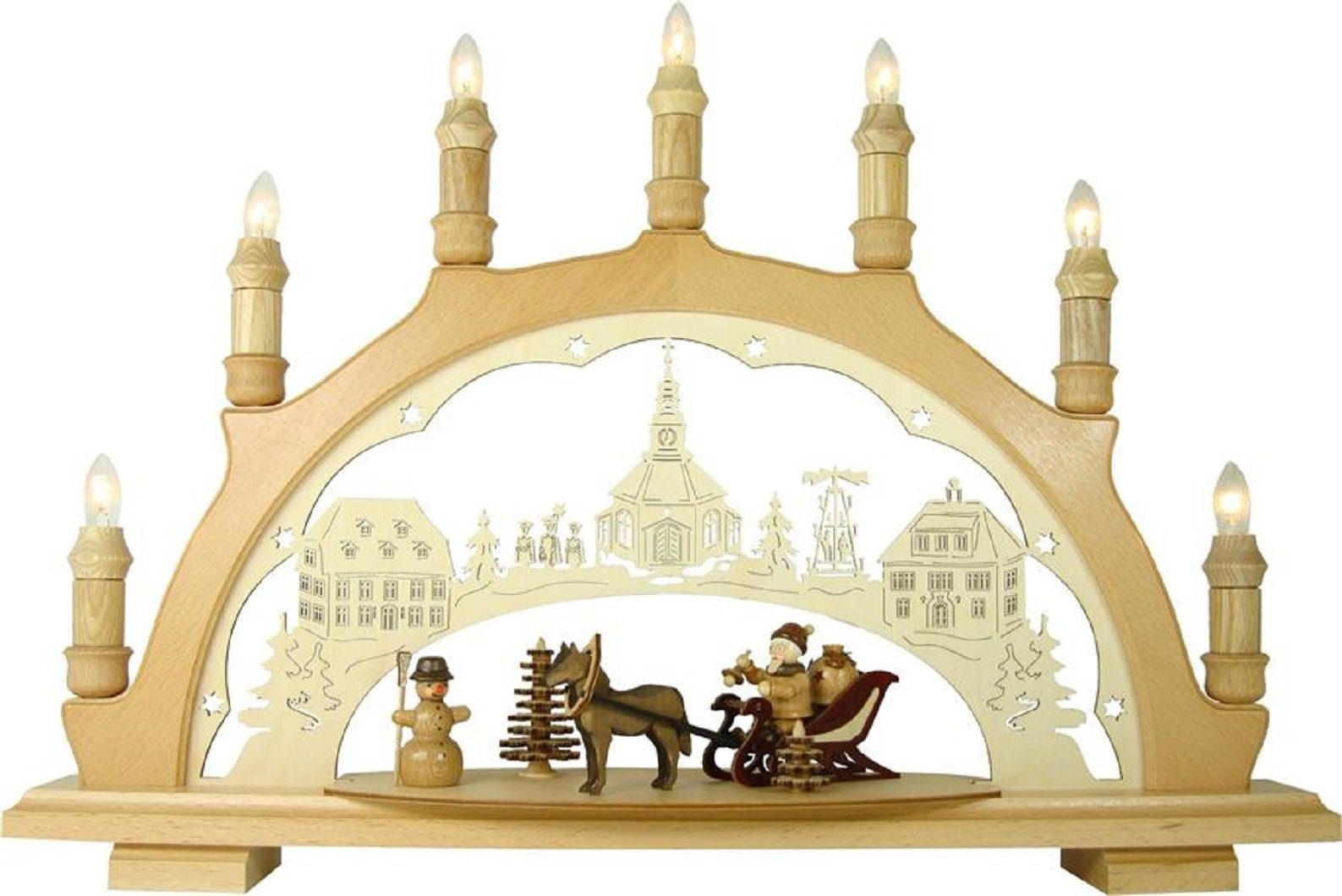 Der Lenk und Sohn Lichterbogen Weihnachtsmann mit Schlitten ist 7 - flammig elektrisch beleuchtet (220 V).