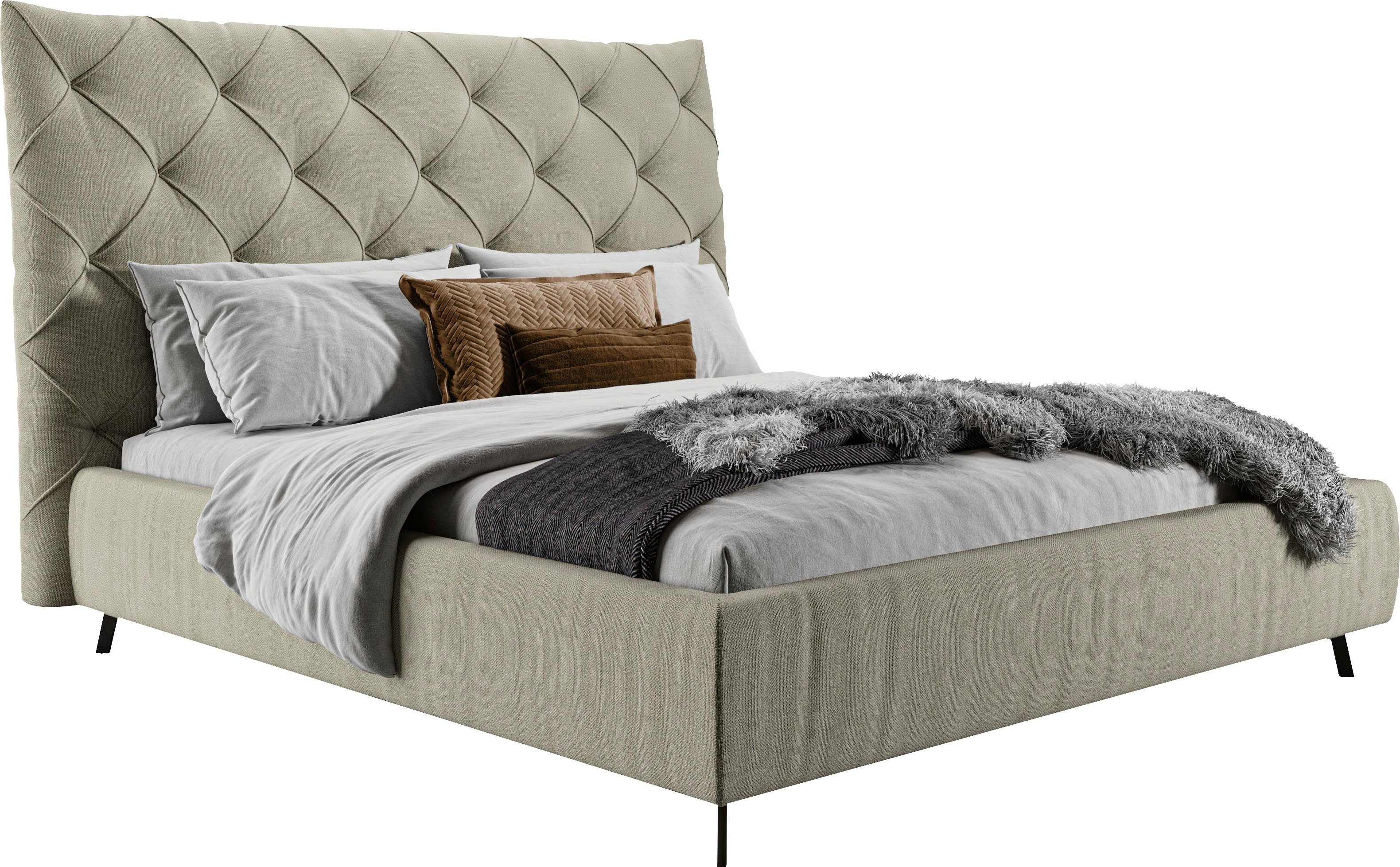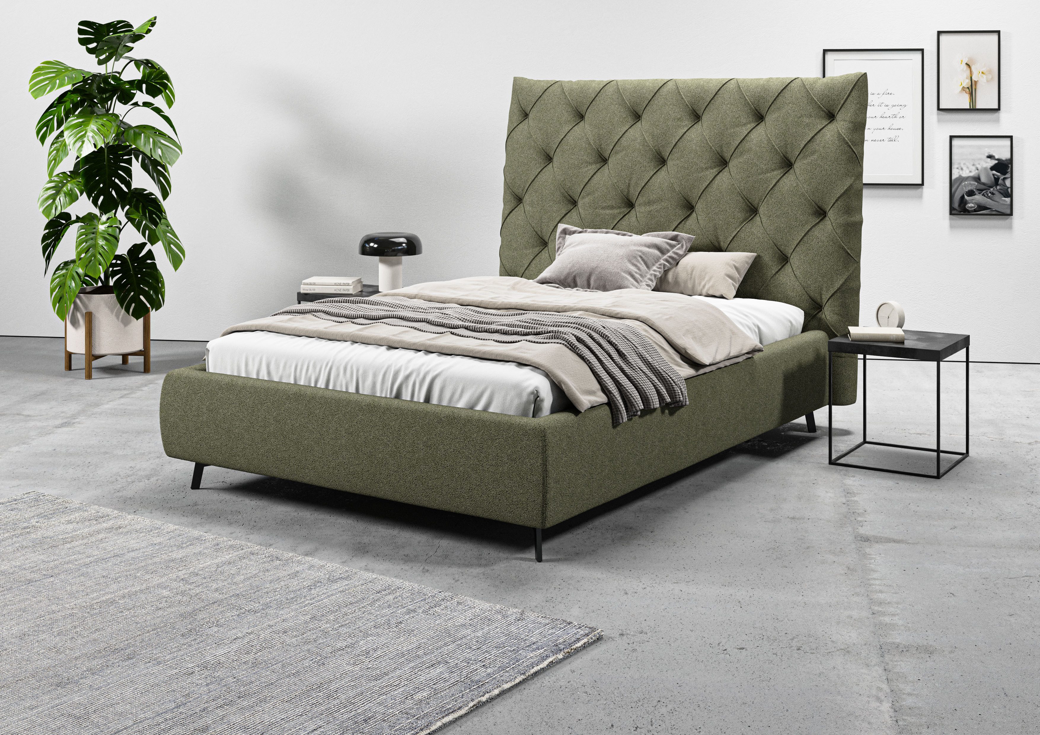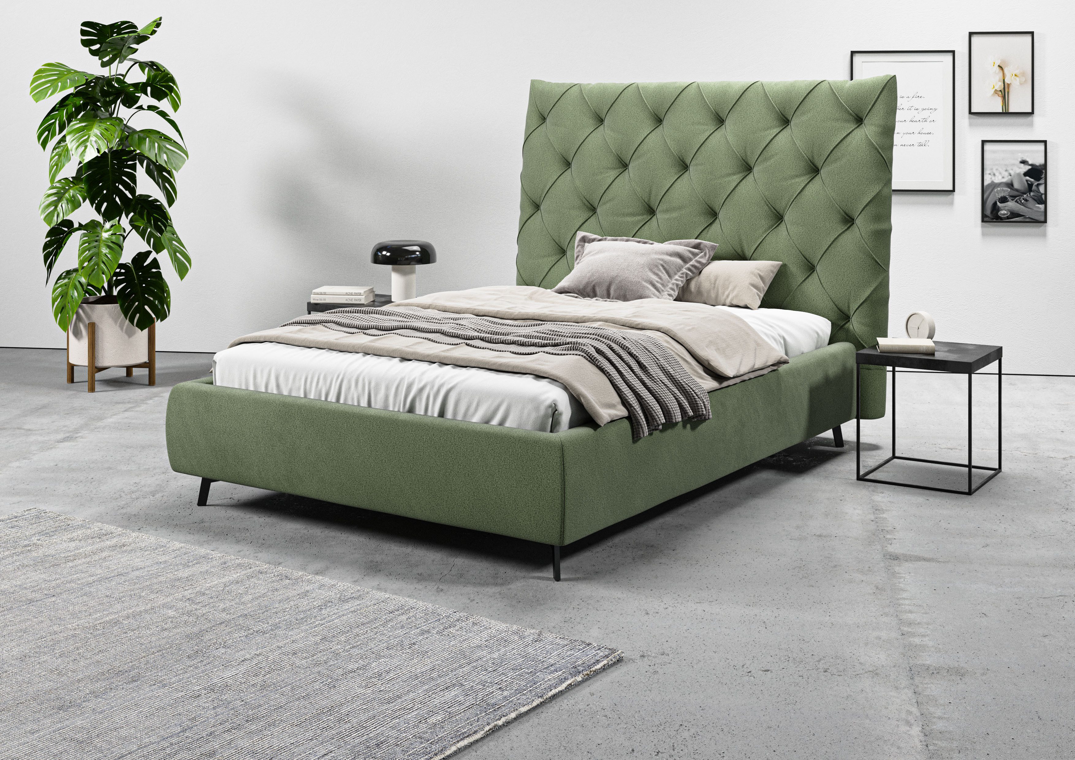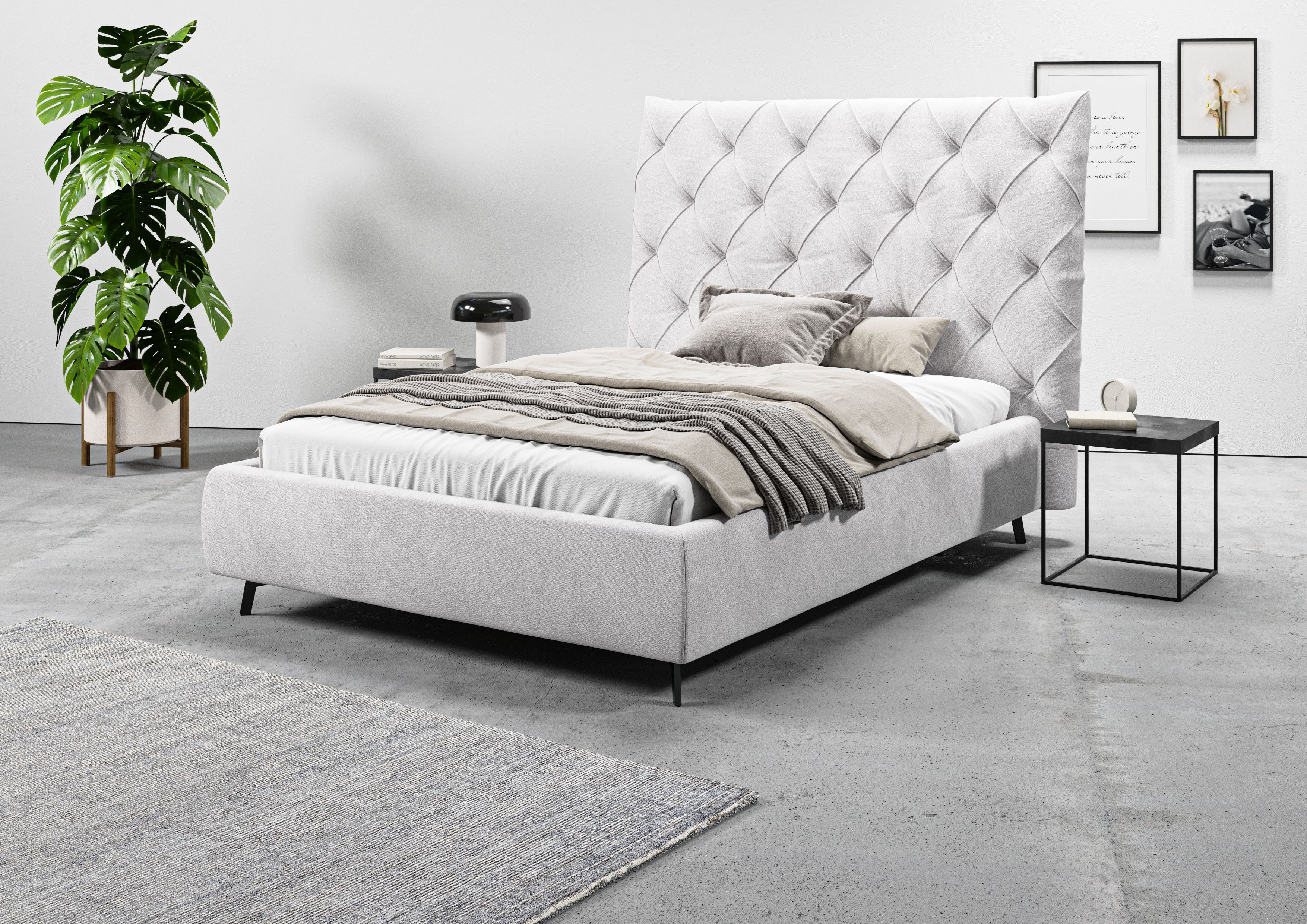 Dieses Polsterbett »Maxime, in 4 Breiten bis 200cm, auch in Leder« von Leonique zeichnet sich durch einen gemütlichen Bezug und ein gepolstertes Kopfteil aus. An diesem kannst du dich entspannt zurücklehnen und nach einem anstrengenden Tag zur Ruhe kommen. Bei etwa 280 Kilogramm liegt die maximale Belastbarkeit. Das gepolsterte Bettgestell ist mit konischen Füßen versehen. Das Kopfteil ist 143 cm hoch.
