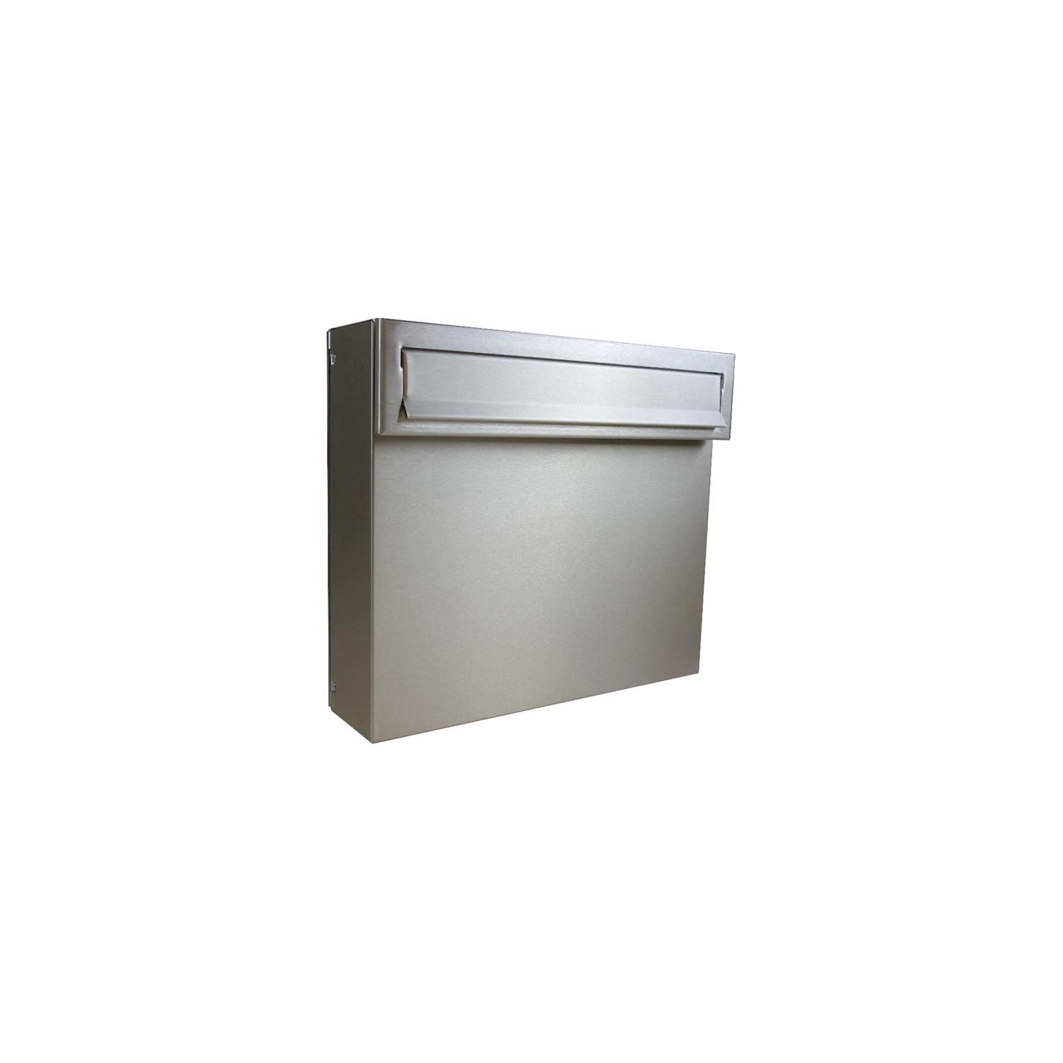 Der Kasten und die Frontplatte sind aus hochwertigem V2A Edelstahl gefertigt. Somit ist der A-050 Edelstahl Tor Durchwurfbriefkasten witterungsbeständig und langlebig. Der Briefkasten ist 10 cm tief und besitzt ein Volumen von 12,2 Litern. Bestellbar ist der A-050 nur ohne Namensschild und ohne Klingel.