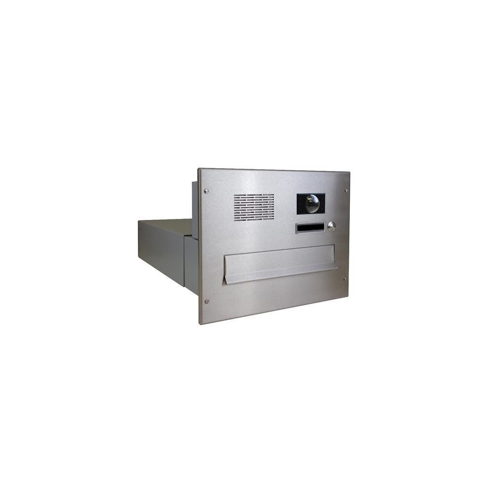 Der B-042 Kamera Durchwurfbriefkasten aus Edelstahl überzeugt durch seine elegante Optik und großzügigen Stauraum. Dank des waagerecht angelegten Mauerlochs ist die Installation im Vergleich zu schrägen Briefkästen deutlich einfacher. Die robuste Bauweise aus verzinktem und pulverbeschichtetem Stahlblech sowie die V2A Edelstahl-Frontplatte und Entnahmetür sorgen für besondere Langlebigkeit.