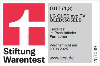 Das Onlinemagazin der „Stiftung Warentest“ testet den LG OLED55C5ELB im Einzeltest. Der 55-Zoll-Bildschirm bietet eine „sehr gute“ Bildqualität mit einem stabilen Betrachtungswinkel und ist für eine helle Umgebung „sehr gut“ geeignet. Der Ton ist „sehr gut“. Das Gerät ist einfach zu installieren und bietet „gute“ Anschlüsse sowie eine „gute“ Aufnahmefunktion. Der Fernseher erzielt das Gesamtergebnis „GUT (1,8)“.