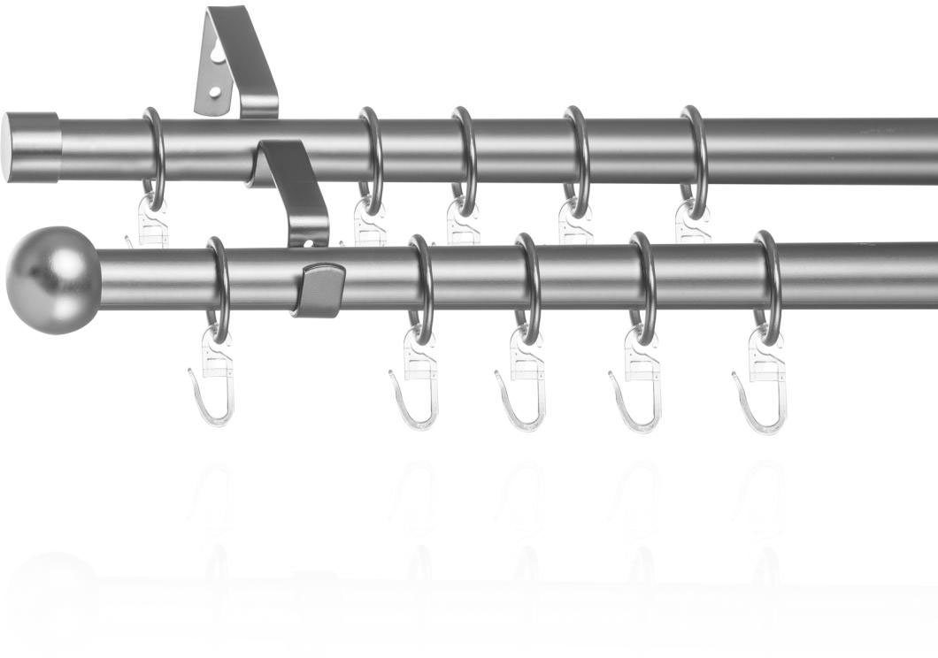 Beschreibung | Mit der zweiläufigen, ausziehbaren Gardinenstange bringen Sie Gemütlichkeit und Stil in Ihre Wohnräume. Mit ihrem modernen Design lässt sich die Vorhanghalterung in jeden Wohnraum wie Schlafzimmer, Wohnzimmer, Küche oder ins Kinderzimmer integrieren. Die Vorhangstange besteht aus stabilem Metall und eignet sich somit nicht nur für leichte Schals, sondern auch für schwere Stores und Vorhänge. Die Träger sind ebenso aus Metall gefertigt - das hat den Vorteil, dass die Stilgarnitur immer fest und gerade an der Wand hängt. Der Vorzug bei dieser Vorhangstange ist die individuelle Anpassung auf die gewünschte Довжина. Die zwei Rohre haben unterschiedliche Durchmesser (16 und 19 mm) und können so ineinander verschoben werden. Sollte die Gardinenstange dennoch zu lang sein, können die Rohre ganz einfach mit einer Metallsäge auf das Wunschmaß gekürzt werden (Maßanfertigung Gardinenstange). Eine weitere Besonderheit sind die zwei Läufe, die die Möglichkeit bieten bspw. eine dekorative Gardine mit einem Store oder Verdunkelungsvorhang zu kombinieren. Mit den beiliegenden Ringen und Faltenlegehaken können Gardinen und Fenstervorhänge im Handumdrehen an die Stange gehängt werden. Im Lieferumfang sind alle notwendigen Materialien für eine schnelle und einfache Montage enthalten. |