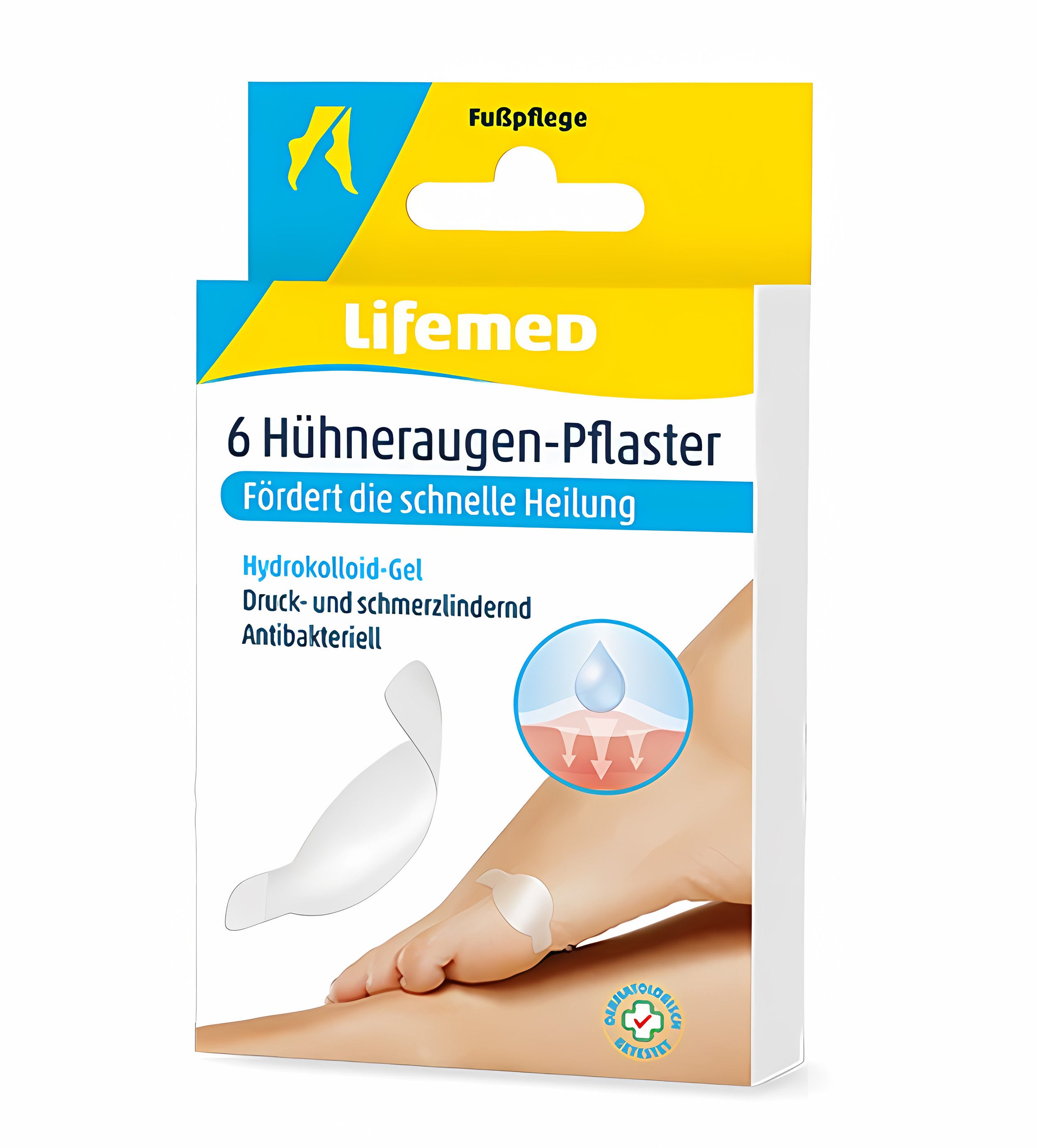 Die Lifemed Hühneraugen-Pflaster fördern durch einen optimalen Feuchtigkeitsausgleich die natürliche Heilung von Hühneraugen. Mit der Anwendung bildet die Hydrokolloid-Struktur ein gelartiges Schutzpolster, das Druck und Schmerz lindert. Die Pflaster schmiegen sich wie eine zweite Haut an, schützen das Hühnerauge vor Wasser, Schmutz und Bakterien und senken das Infektionsrisiko.