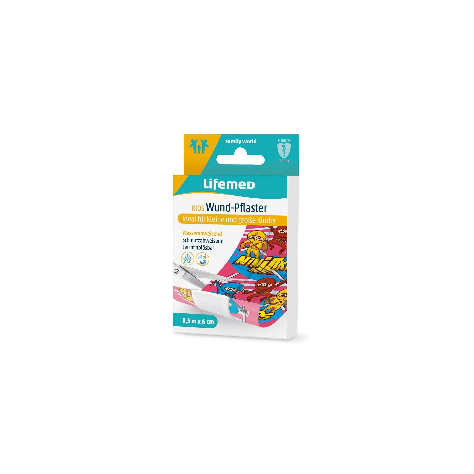 Die KIDS-Wund-Pflaster von Lifemed® mit fröhlichen Kindermotiven (Ninja-Motiven) eignen sich zur sicheren Wundversorgung für große und kleine Kinder. Ein optimaler Austausch von Luft- und Hautfeuchte, auch bei oberflächlichem Kontakt mit Wasser und Schmutz, ist durch die Mikroporen des atmungsaktiven Trägermaterials gewährleistet. Die Wundauflage verklebt nicht mit der Wunde. Die Motivfarben sind flüssigkeitsfest und für Kinder absolut unbedenklich.