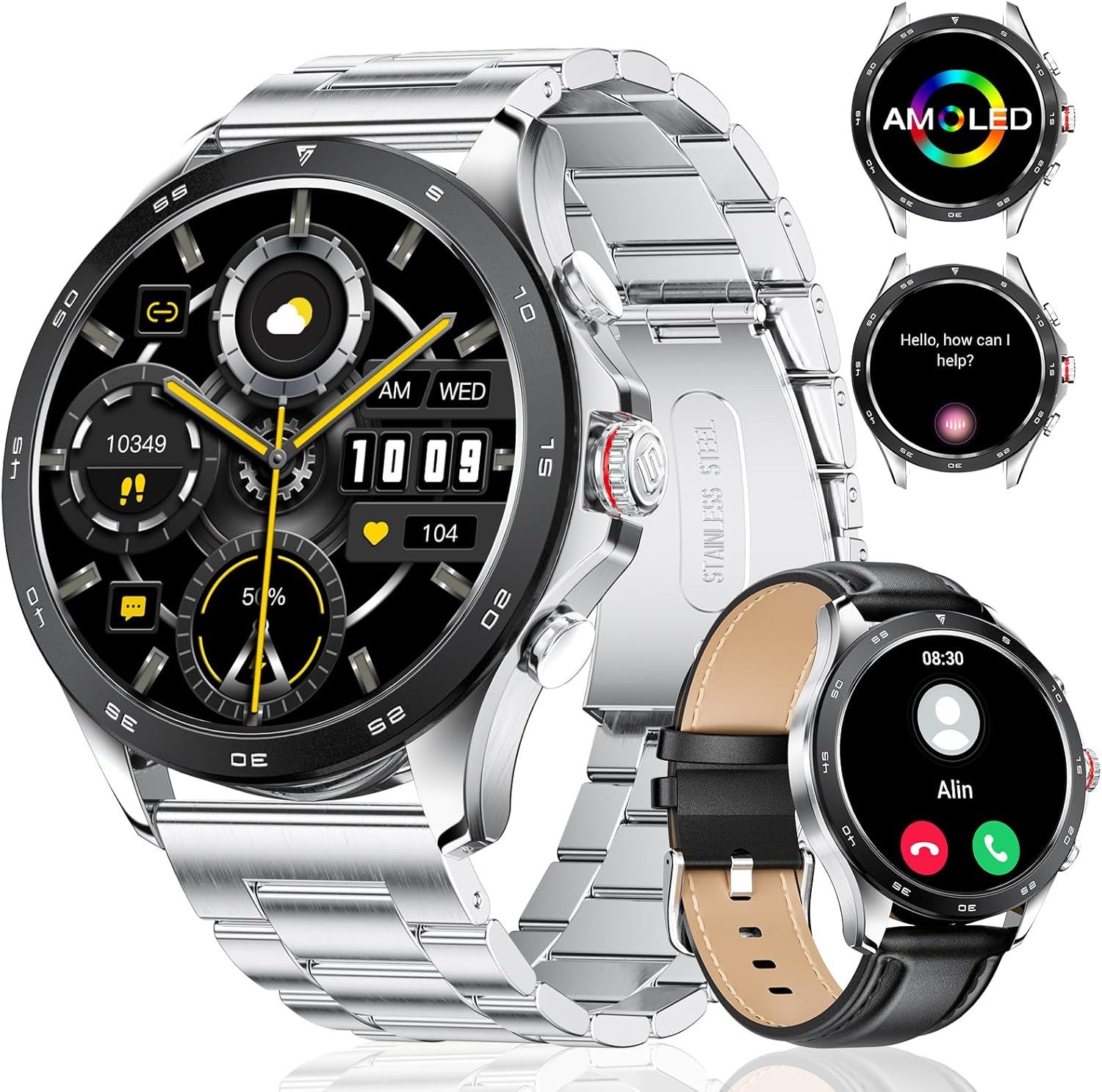 Zusatzfunktionen | Smartwatch mit 1.43 Zoll AMOLED Display Smartwatch mit Always On Display Smartwatch mit Bluetooth Telefonie Smartwatch mit WhatsApp Benachrichtigung Smartwatch mit Instagram Benachrichtigung Smartwatch mit Twitter Benachrichtigung Smartwatch mit Facebook Benachrichtigung Smartwatch mit Herzfrequenzmessung Smartwatch mit SpO2 Messung Smartwatch mit Schlafüberwachung Smartwatch mit Blutdruckmessung Smartwatch mit 100 Sportmodi Smartwatch wasserdicht Herren IP68 Smartwatch mit Leder und Edelstahlarmband Smartwatch mit 400 mAh Akku |