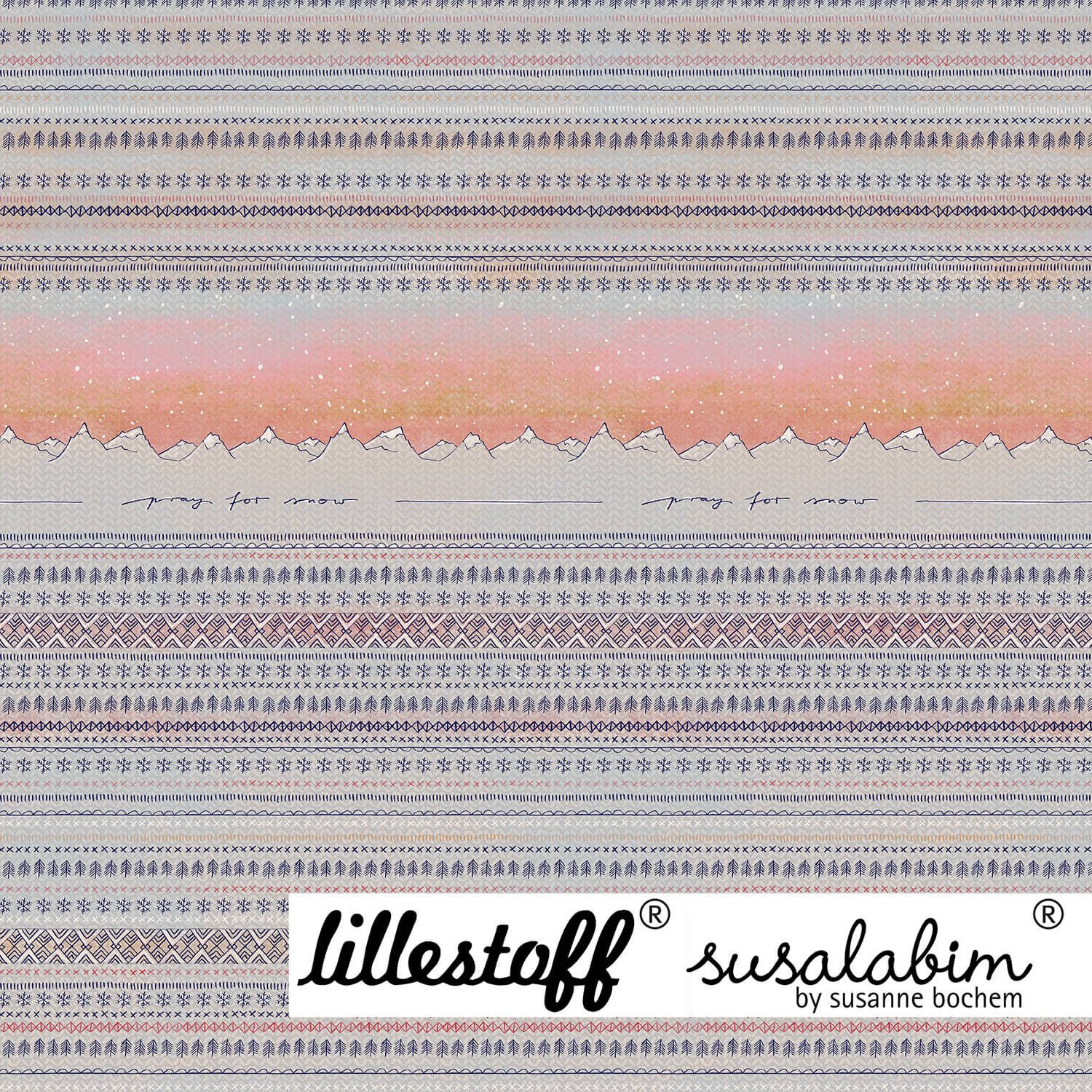 Ein wundervolles Panel aus der Feder von Susalabim für Lillestoff kommt hier für den Herbst. In weichen rosa, lila und fliedertönen ist das Motiv gehalten, welches vom weiten wie ein einfach gestreifter Stoff wirkt. Kommt man dem Design aber näher erkennt man in den Linien kleine Schneeflocken, Tannenbäume, Schriftzüge, nordische Muster und vieles Mehr. Hier ein Hoodie, Sweatjacke oder Kleid lässt den Stoff richtig toll zur Geltung kommen.