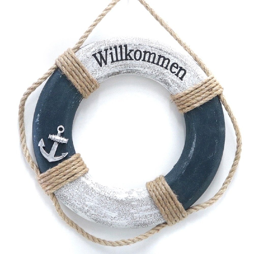 Rettungsring mit Tau, Maritime Wanddeko Rettungsring und Anker aus Holz und Jute. Maritime Wanddekoration im Landhausstil in den Farben des Meeres Antik Weiß und Blau.