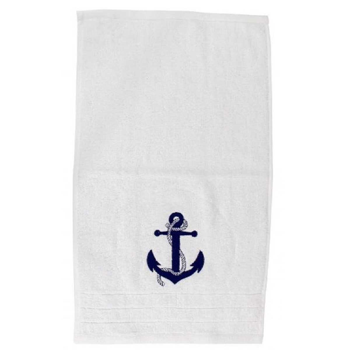 Gästehandtuch, Badetuch, Frottee Handtuch im Marine Stil aus Baumwolle, Weiß mit blauem Anker, Spitzenqualität 600 g/m². Das Handtuch ist waschbar bis 40 °C, bitte mit ähnlichen Farben waschen und nicht bleichen. Sie sind bei niedriger Temperatur trocknergeeignet. Bei der marineblauen Farbe kann es bei höheren Temperaturen bei den ersten Wäschen zu Verfärbungen kommen.
