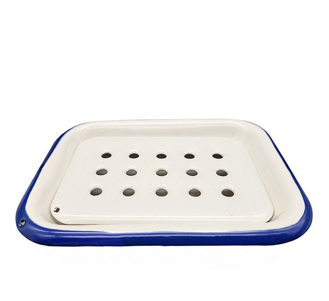 Nostalgie Seifenschale Emaille Seifenhalter (2 teilig), flache Seifenablage cremefarbig mit blauem Rand. Diesen Artikel haben wir in unterschiedlichen Dekoren. Wir führen ein sehr umfangreiches Меню an Emailwaren. Dunkle Öffnungen auf den Artikeln sind keine Materialfehler sondern notwendige Aufhängelöcher für den Brennvorgang.