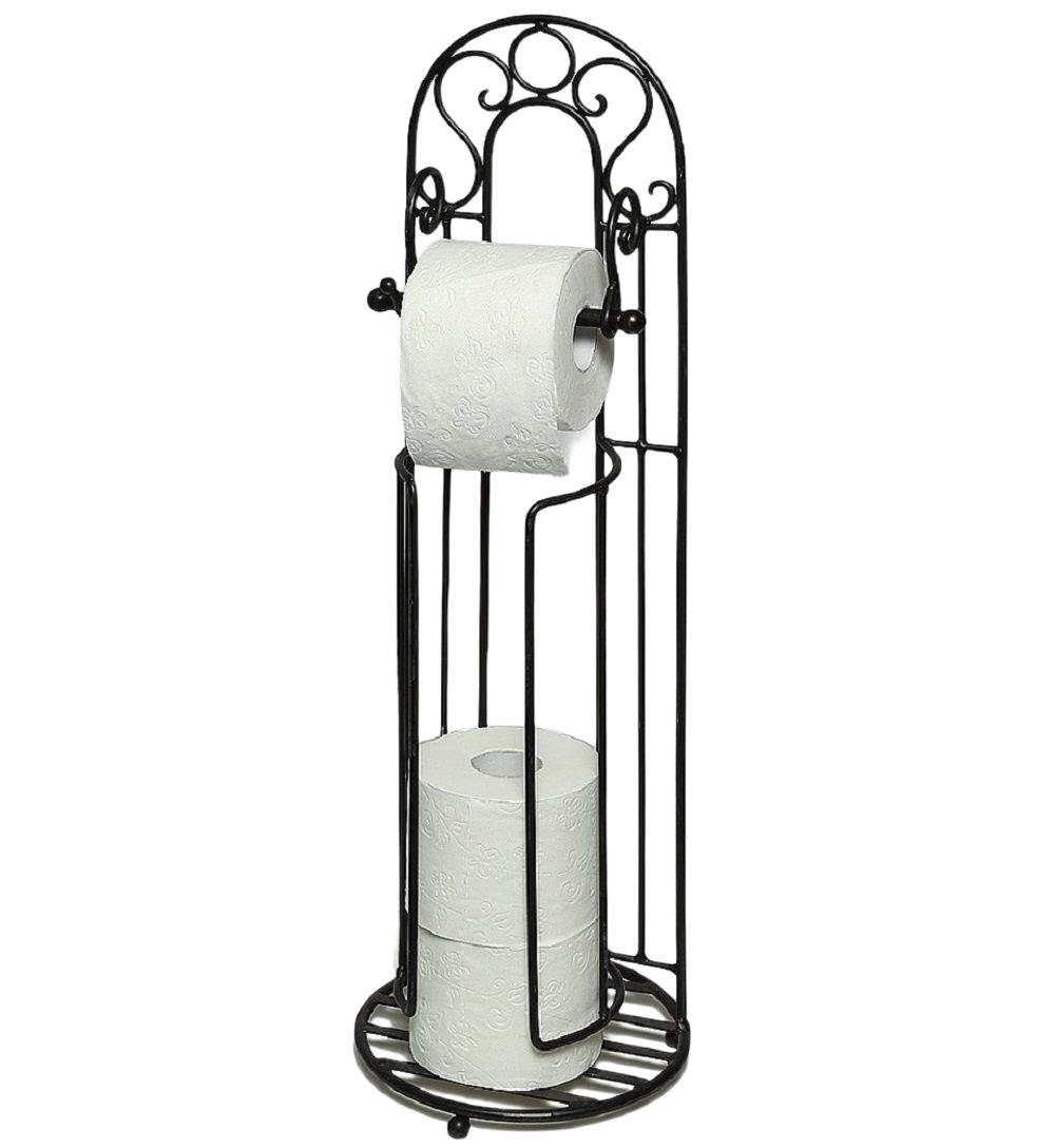 Nostalgie Toilettenpapierhalter, Papierrollenhalter, WC Rollenständer aus Schmiedeeisen in Antik Schwarz. Mit seinen vier Kugelfüßen steht der Toilettenpapierhalter fest auf dem Boden. Ein Austausch der Toilettenrollen erfolgt problemlos, ohne schrauben zu müssen. In dem dafür vorgesehenen Fach können noch weitere vier Rollen Toilettenpapier aufbewahrt werden.