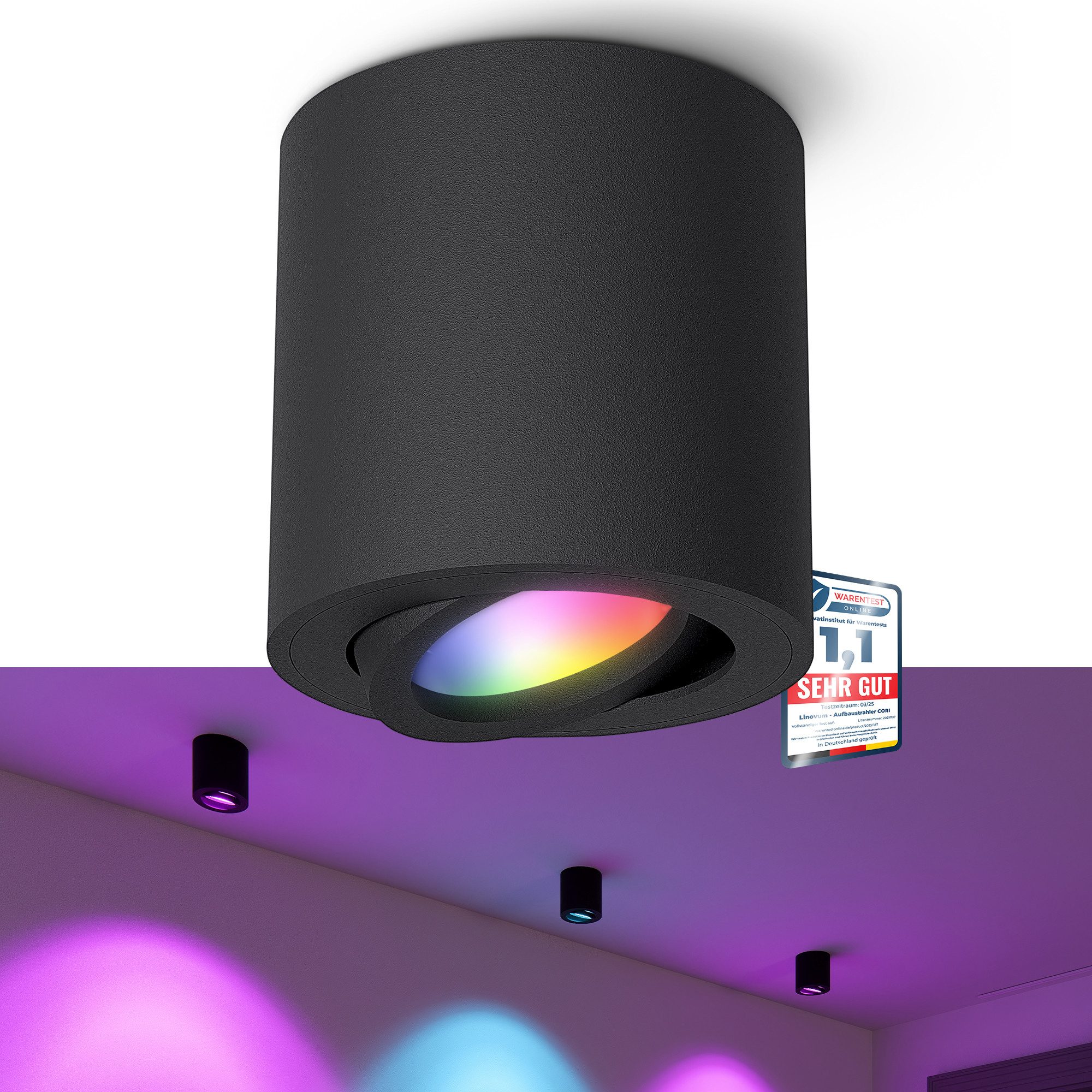 Lieferumfang | 1x Aufbauleuchte CORI schwarz1x Smart RGB Leuchtmittel GU101x Montagematerial |