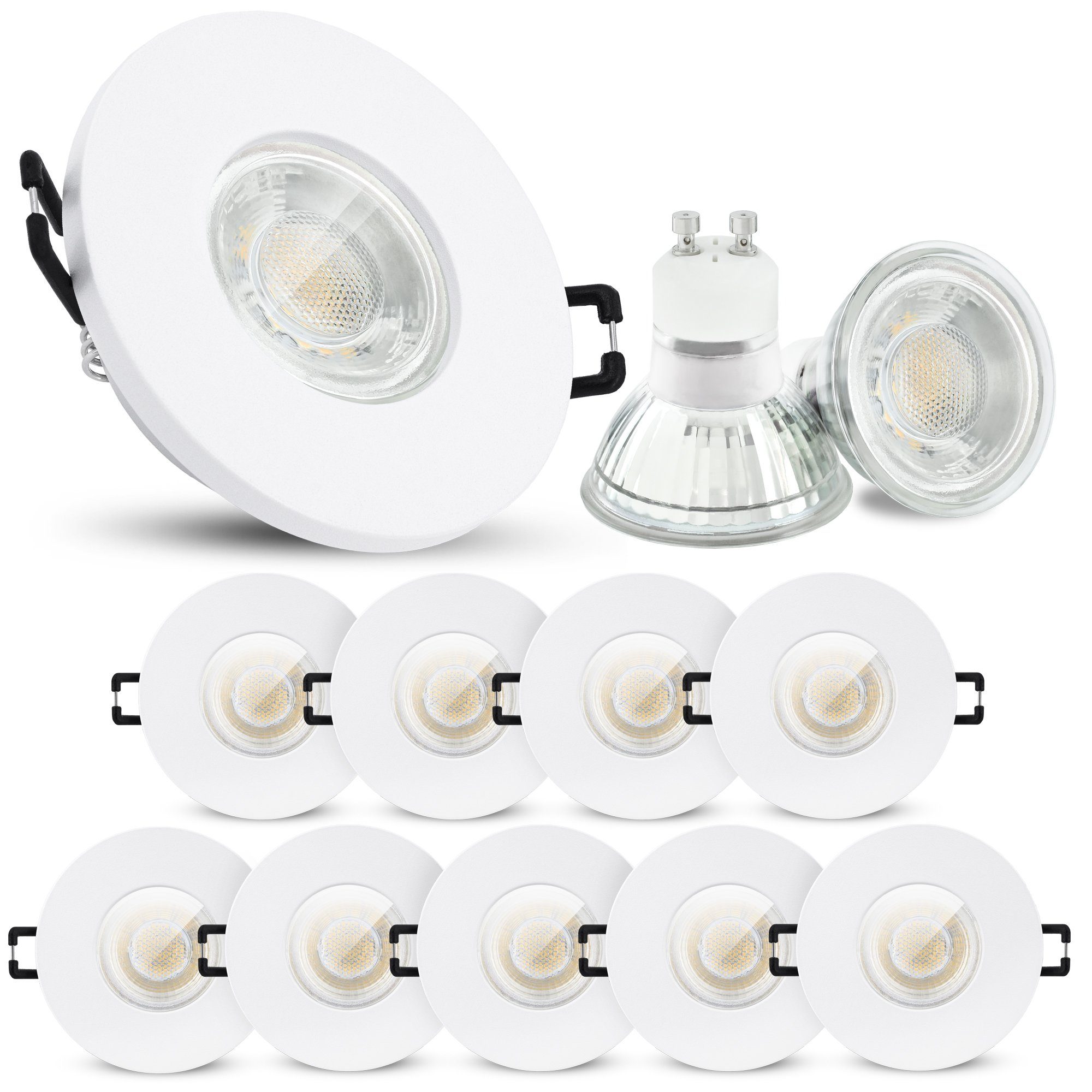 Lieferumfang | 10x Einbaurahmen IP65 weiß rund10x GU10 Fassung mit Anschlusskabel10x LED GU10 3W neutralweiß |