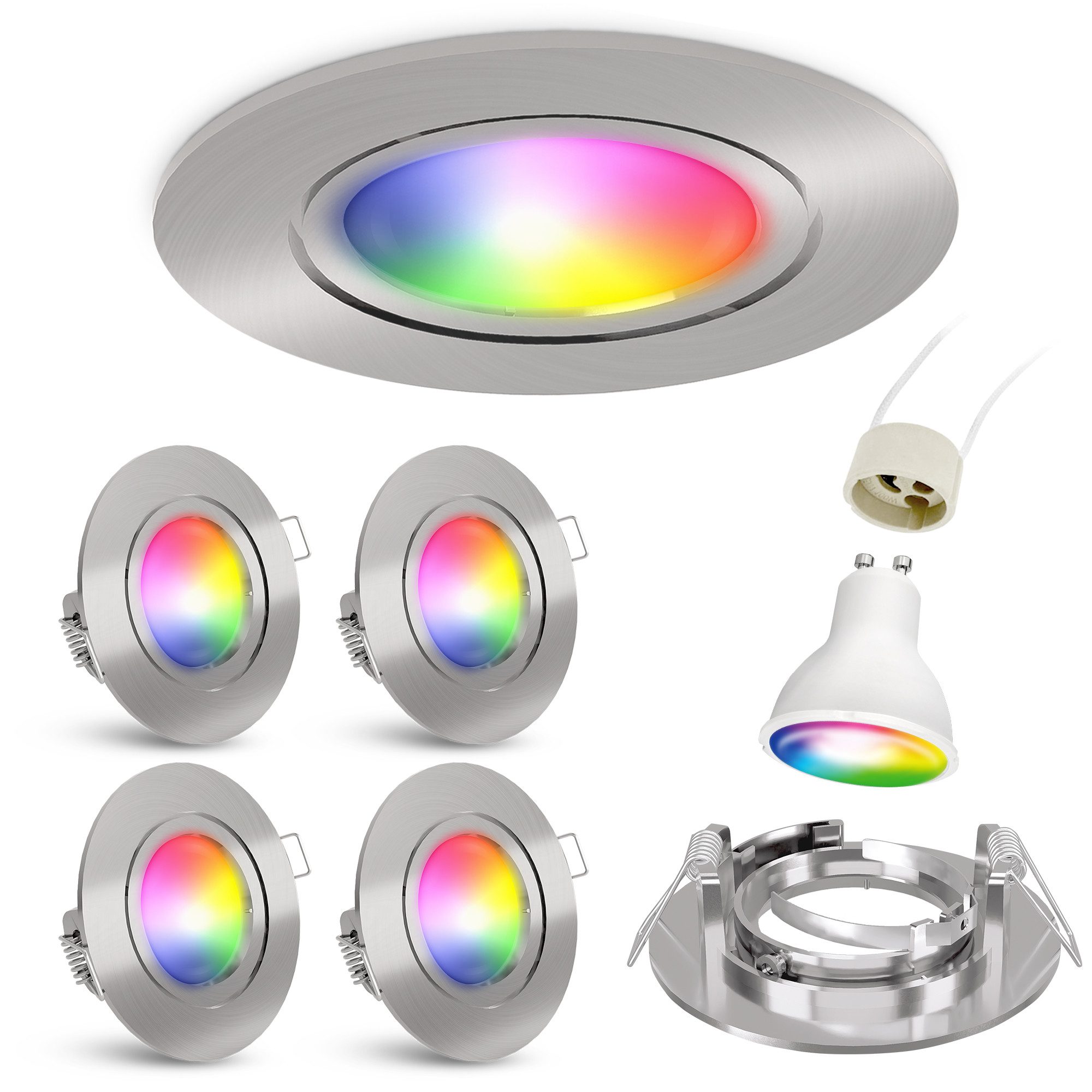 Lieferumfang | 4x Smart GU10 Lampe4x Einbaustrahler Rahmen Edelstahl Optik rund starr4x GU10 Fassung |