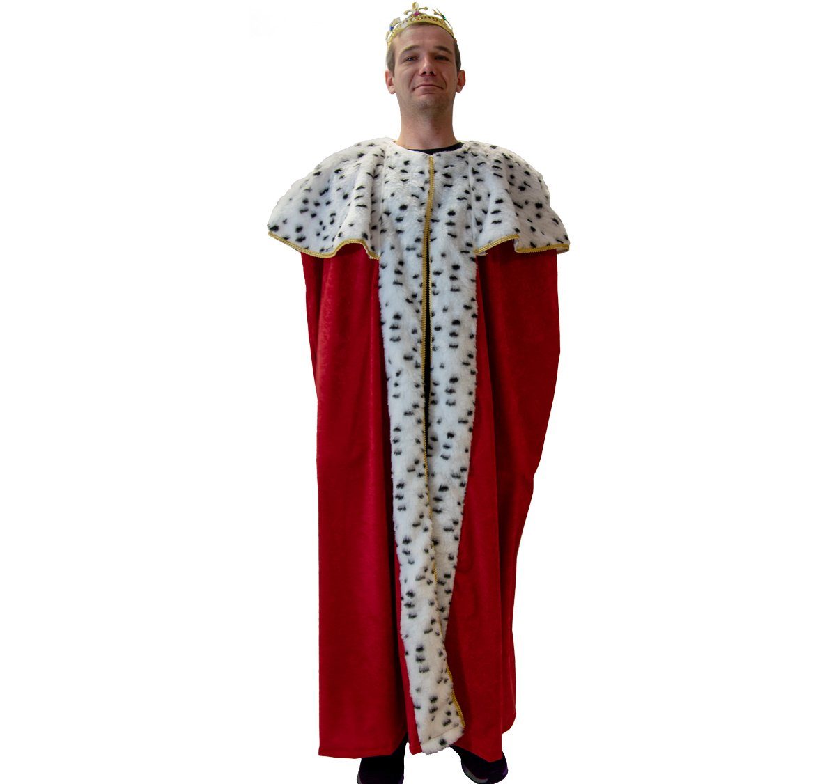 Der Mantel besticht durch seine dunkelrote Farbgebung und Plüschstoff in Hermelin-Optik. Der große und weit ausgestellte Kragen ist ebenfalls im Hermelin-Muster gestaltet. Detailreich mit goldener Zierborte verarbeitet. Mit Hilfe von Klettverschluss unterhalb des Kinns lässt sich der Mantel kinderleicht schließen. Bei dem Königskostüm handelt es sich um eine Einheitsgröße, der Umhang ist etwa 140 Zentimeter lang. Made in EU!
