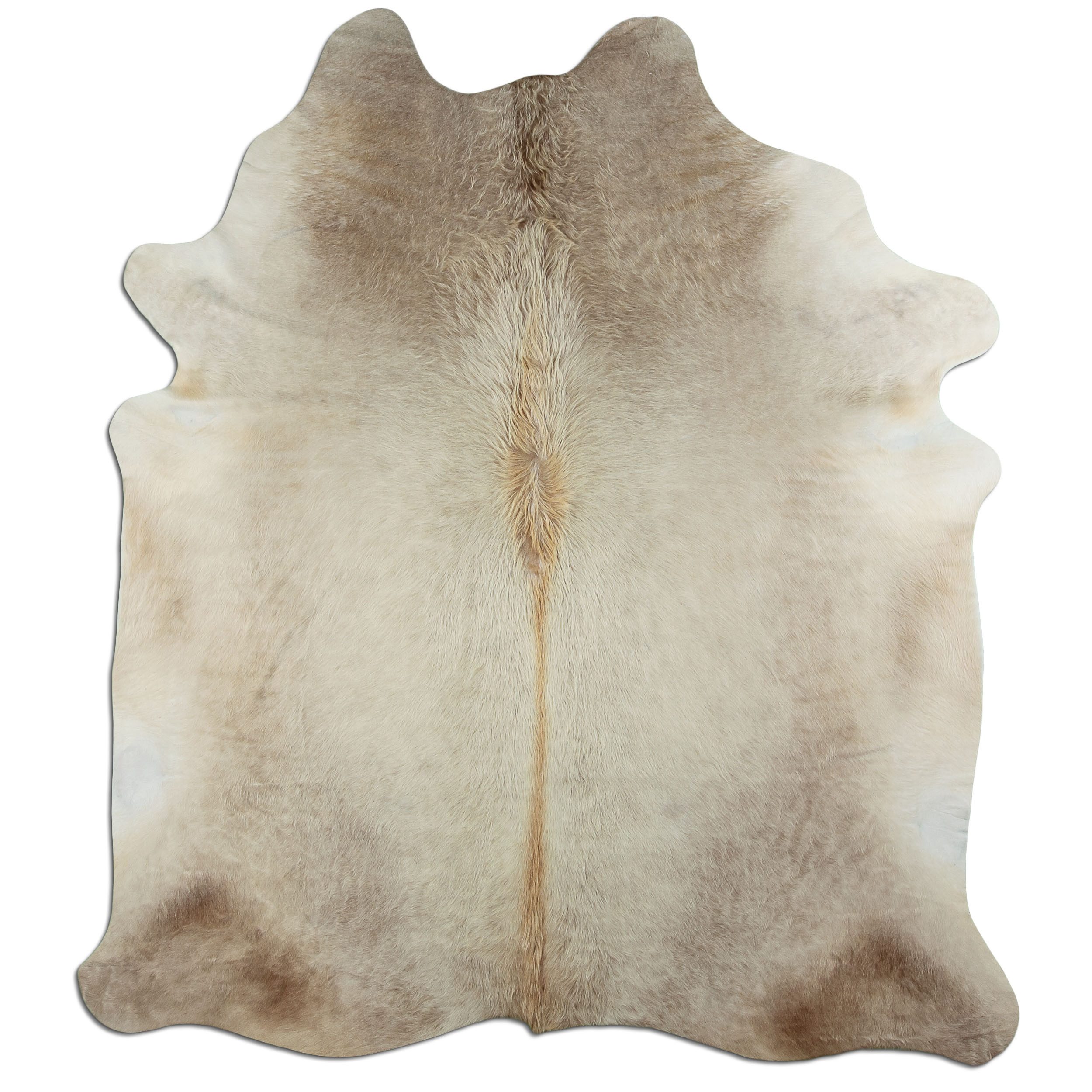 Ein freundliches Kuhfell mit dominanten Beigetönen und dezenten braunen Schattierungen. Es wirkt besonders hell und harmonisch und fügt sich problemlos in verschiedene Wohnstile ein. Mit seiner natürlichen Farbgebung sorgt es für Behaglichkeit im Raum.