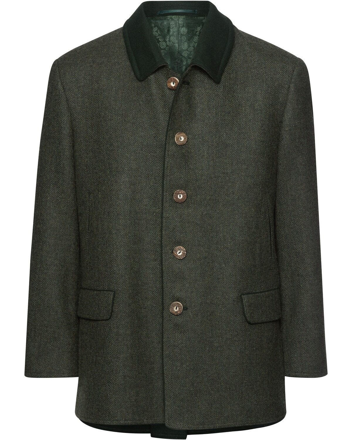 Funktionalität und Komfort im Trachtenlook Der Kurzmantel bietet praktische Funktionalität mit zwei vertikalen Schubtaschen, zwei Frontpattentaschen und drei Innentaschen. Die Kellerfalte am Rücken mit Zierriegel sorgt für eine natürliche Bewegungsfreiheit. Das komplett gefütterte Innere ist mit einem changierenden Paisley-Futter ausgestattet, was den Tragekomfort erhöht und das elegante Erscheinungsbild abrundet.