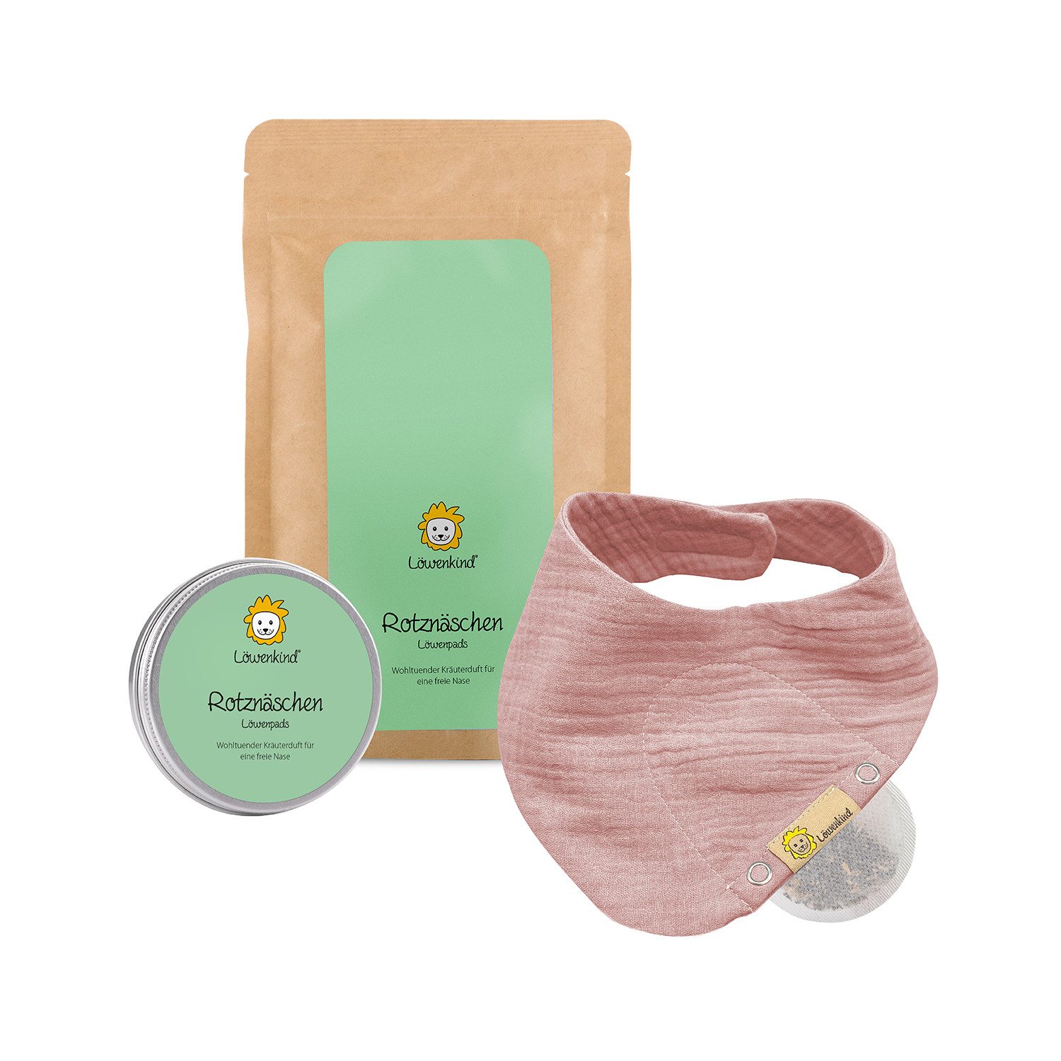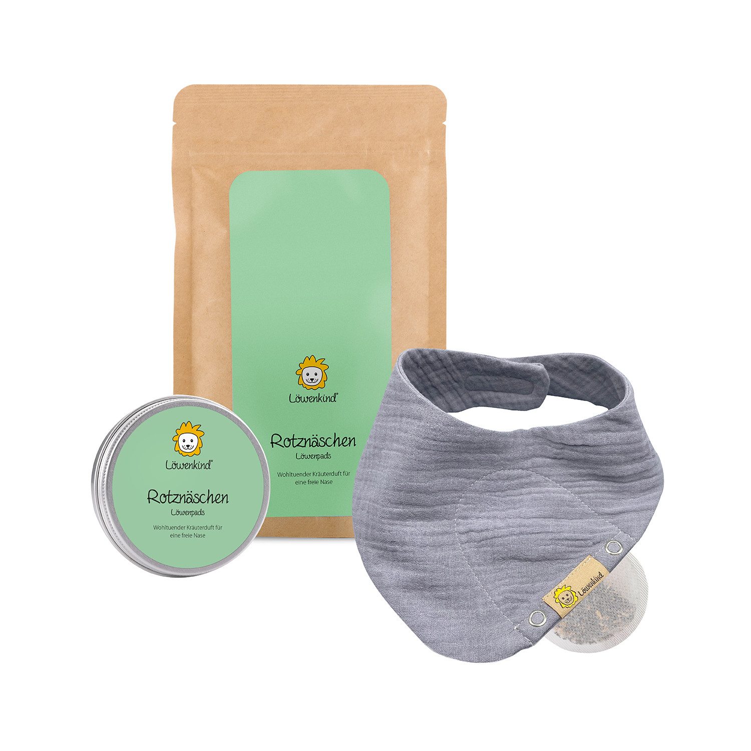 Das Rotznäschen-Set von Löwenkind bietet eine natürliche Unterstützung für die kältere Jahreszeit und kombiniert hochwertige Materialien mit der Kraft der Natur. Das Set enthält ein Musselin-Halstuch aus 100% Bio-Baumwolle und 15 Rotznäschen-Pads. Das Halstuch ist sanft zur Haut und ideal für Kinder und Babys . Die Розмір "Mini" eignet sich für Babys und Kinder von 0-4 Jahre. Die Rotznäschen-Kräuterpads sind mit einer sorgfältig ausgewählten Kräutermischung aus Kamillen-, Schlüsselblumen-, Königskerzenblüten und Rosenblütenblättern gefüllt. Die Kombination erzeugt einen angenehmen Kräuterduft, der das Wohlbefinden Deines Kindes unterstützt und besonders in der Erkältungszeit förderlich ist. Dabei ist die Anwendung sehr simpel und sicher gehalten. Das Kräuterpad wird in die dafür vorgesehene Pad-Tasche im Halstuch platziert. Das Halstuch wird am Kind angebracht und der Kräuterduft wird vom Kind aufgenommen. Das Pad kann individuell und je nach Bedarf eingesetzt werden. Ein Pad kann im Schnitt 5 Tage genutzt werden. Somit bist Du mit dem Rotznäschen-Set ganze 75 Tage versorgt.