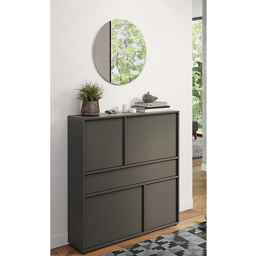 Der runde Spiegel öffnet optisch den Raum, während der großzügige Schuhschrank mit seiner klaren, grifflosen Front für Ordnung sorgt. Dank Push-to-open und variabler Montage kannst du ihn flexibel anpassen – an deine Bedürfnisse und deinen Stil. In elegantem Graphit gehalten, wirkt das Set unaufdringlich und hochwertig.