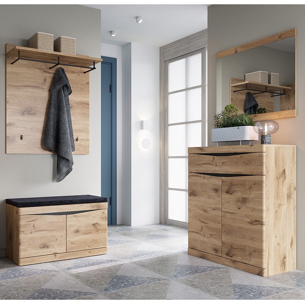 Diese Garderobenmöbel bestechen durch ihr zeitloses, modernes Design und ihre herausragende Funktionalität. Die warmen Eiche Töne schaffen ein besonderes Ambiente in deinem Flur, während die anthrazitfarbenen Abdeckplatten hinter den Griffmulden dezente Akzente setzen und das hochwertige Erscheinungsbild der Serie unterstreichen. Perfekt aufeinander abgestimmt, umfasst die Serie alles von einer Kommode bis hin zu einem Spiegel – so lässt sich jeder Flur individuell und stilvoll gestalten.
