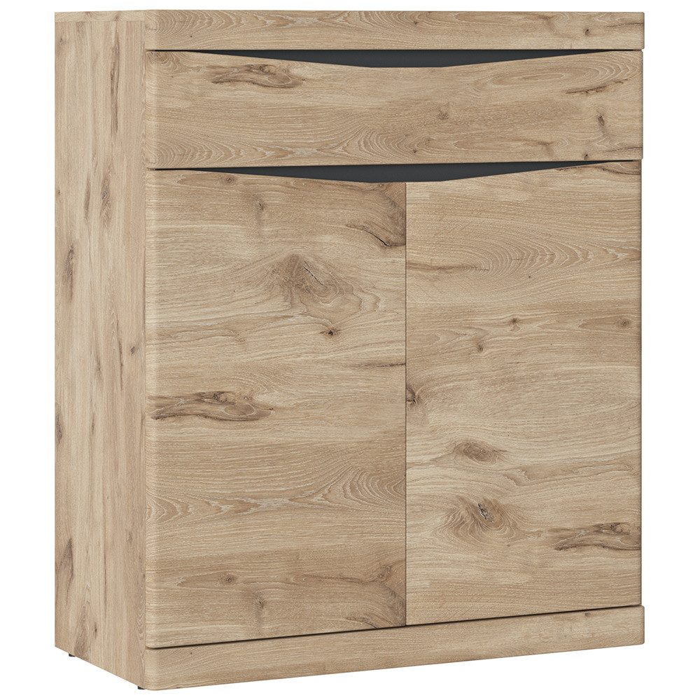 Diese Garderobenmöbel bestechen durch ihr zeitloses modernes Design und ihre herausragende Funktionalität. Die warmen Eiche Töne schaffen ein besonderes Ambiente in deinem Flur, während die anthrazitfarbenen Abdeckplatten hinter den Griffmulden dezente Akzente setzen und das hochwertige Erscheinungsbild der Serie unterstreichen. Perfekt aufeinander abgestimmt, umfasst die Serie alles von einer Kommode bis hin zu einem Spiegel – so lässt sich jeder Flur individuell und stilvoll gestalten.
