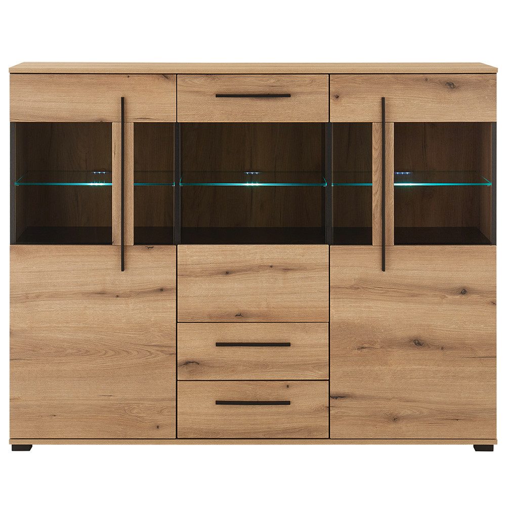 Dieses Highboard macht Eindruck – durch Licht, Platz und eine richtig starke Ausstrahlung. Hinter drei Glastüren setzen beleuchtete Glasböden deine Deko oder Gläser stimmungsvoll in Szene. Zwei Schubladen darunter bieten dir zusätzlichen Stauraum für alles, was du schnell und ordentlich verstauen willst. Die Kombination aus wohnlicher Eicheoptik, modernen Griffen und gemütlichem Licht passt perfekt in jedes Wohnzimmer oder Esszimmer. Ein Möbelstück, das nicht nur praktisch ist – sondern richtig was hermacht.