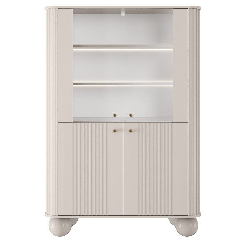 Die markante, gerillte Struktur und goldfarbenen Griffe setzen zeitlose Akzente. Oben präsentieren Glasfronten mit LED-Beleuchtung deine schönsten Stücke, unten bieten geschlossene Türen großzügigen Stauraum. Die Softclose-Funktion sorgt für sanftes Сховати. Perfekt für Wohnzimmer, Esszimmer oder Flur.