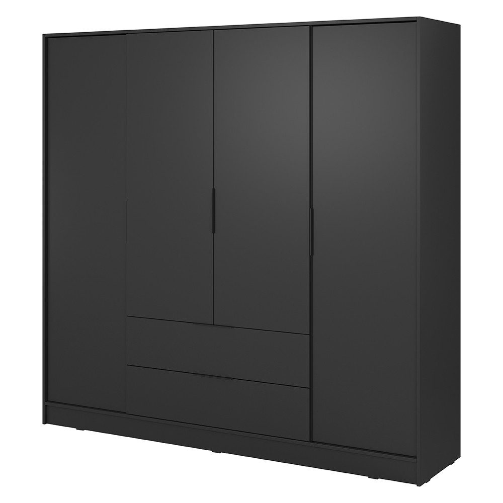 Verleihe deinem Schlafzimmer eine elegante und moderne Note mit unserem Kleiderschrank in Schwarz. Das minimalistische Design mit schwarzen Griffen fügt sich nahtlos in jeden Wohnstil ein und schafft eine zeitlose Atmosphäre. Mit 4 Drehtüren, 2 Schubkästen, einer Kleiderstange und Einlegeböden bietet dieser Schrank großzügigen Stauraum für Kleidung und Accessoires.