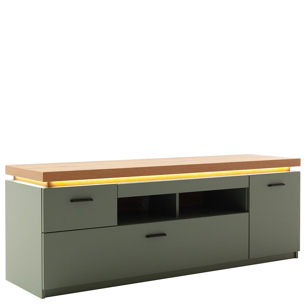 Ein stilvoller Mittelpunkt für dein Home-Entertainment: Dieser TV-Schrank vereint modernes Design mit durchdachtem Stauraum. Die sanft schließende Tür, zwei gedämpfte Schubladen und offene Fächer bieten Platz für Technik und Zubehör. Die harmonische Kombination aus Salbei Grün und Eiche Evoke schafft eine gemütliche Wohnatmosphäre. An der Deckplatte integrierte LED-Akzentbeleuchtung setzt stimmungsvolle Lichtakzente. Dank melaminbeschichteter Oberflächen ist der Schrank besonders widerstandsfähig und leicht zu reinigen.