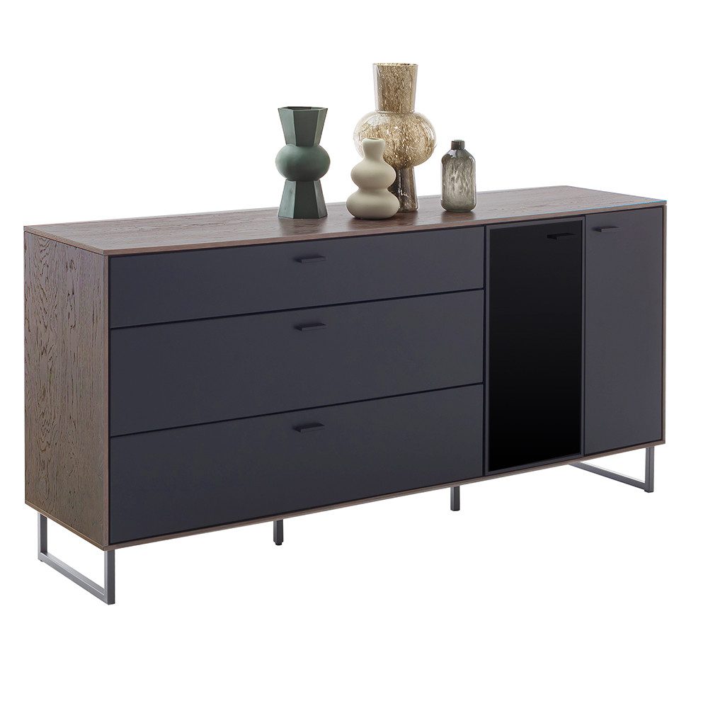 Die Griffe und Füße aus anthrazitfarbenem Metall unterstreichen das moderne Design, während die Türen mit EGS Schwarzglas und anthrazitfarbenem Alurahmen für einen Hauch von Raffinesse sorgen.