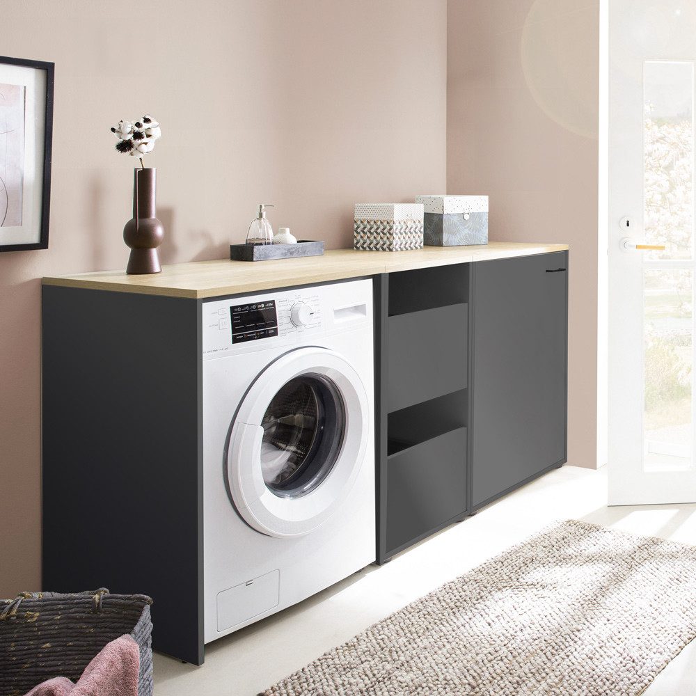 Dieses vielseitige Möbelset kombiniert modernes Design mit praktischer Funktionalität und bietet alles, was du für einen organisierten Hauswirtschaftsraum brauchst. Es umfasst einen Umbauschrank, einen geräumigen Wäscheschrank und einen praktischen Mehrzweckschrank, die zusammen eine harmonische Lösung für Haushaltsgeräte, Wäsche und Utensilien schaffen. Die elegante Farbkombination aus Anthrazit und warmen Eiche-Akzenten sorgt für eine zeitlose und stilvolle Atmosphäre.