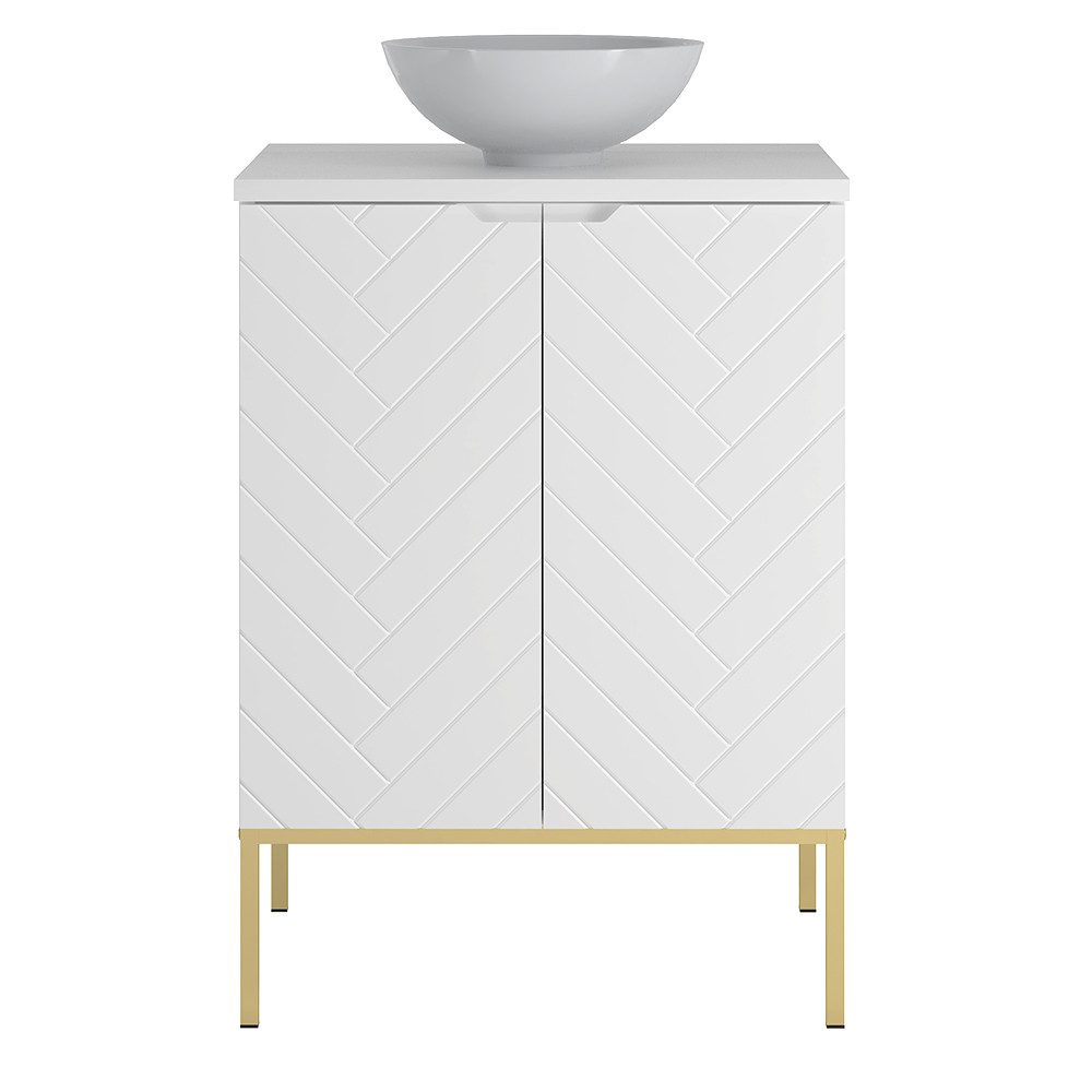Dieser kompakte Waschtisch in edlem weiß matt passt perfekt in kleinere Badezimmer und bringt eine helle, moderne Ausstrahlung mit. Die gefrästen, grifflosen Türen sorgen für ein minimalistisches Design, während das 3D-Fischgrät-Dekor der Fronten einen stilvollen Akzent setzt. Das luxuriöse goldfarbene Fußgestell bietet Stabilität und ergänzt das elegante Gesamtbild. Praktischer Stauraum hinter den zwei Softclose-Türen und einem Einlegeboden sorgt dafür, dass Badutensilien übersichtlich verstaut sind.