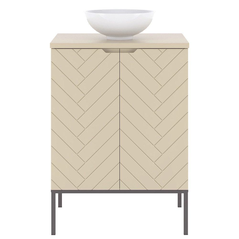 Dieser kompakte Waschtisch in stilvollem kaschmir passt perfekt in dein Badezimmer und bringt eine helle, moderne Ausstrahlung mit. Die gefrästen, grifflosen Türen sorgen für ein minimalistisches Design, während das 3D-Fischgrät-Dekor der Fronten einen stilvollen Akzent setzt. Das luxuriöse schwarze Fußgestell bietet Stabilität und ergänzt das elegante Gesamtbild. Praktischer Stauraum hinter den zwei Softclose-Türen und einem Einlegeboden sorgt dafür, dass Badutensilien übersichtlich verstaut sind.