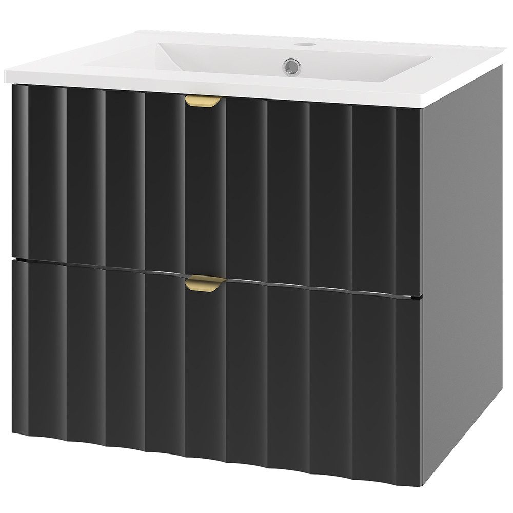 Verleihe deinem Badezimmer ein stilvolles Update mit unserer modernen Badezimmermöbelserie. Die eleganten, gewellten Fronten in schwarz matt verleihen dem Raum einen Hauch von Luxus und lassen ihn neu erstrahlen. Die goldfarbenen Griffe sorgen zusätzlich für ein edles Design. Dank der Softclose-Funktion schließen die Schubladen sanft und leise – ideal für den täglichen Gebrauch. Diese Möbel bieten nicht nur praktischen Stauraum, sondern machen dein Badezimmer zu einer echten Wohlfühloase.