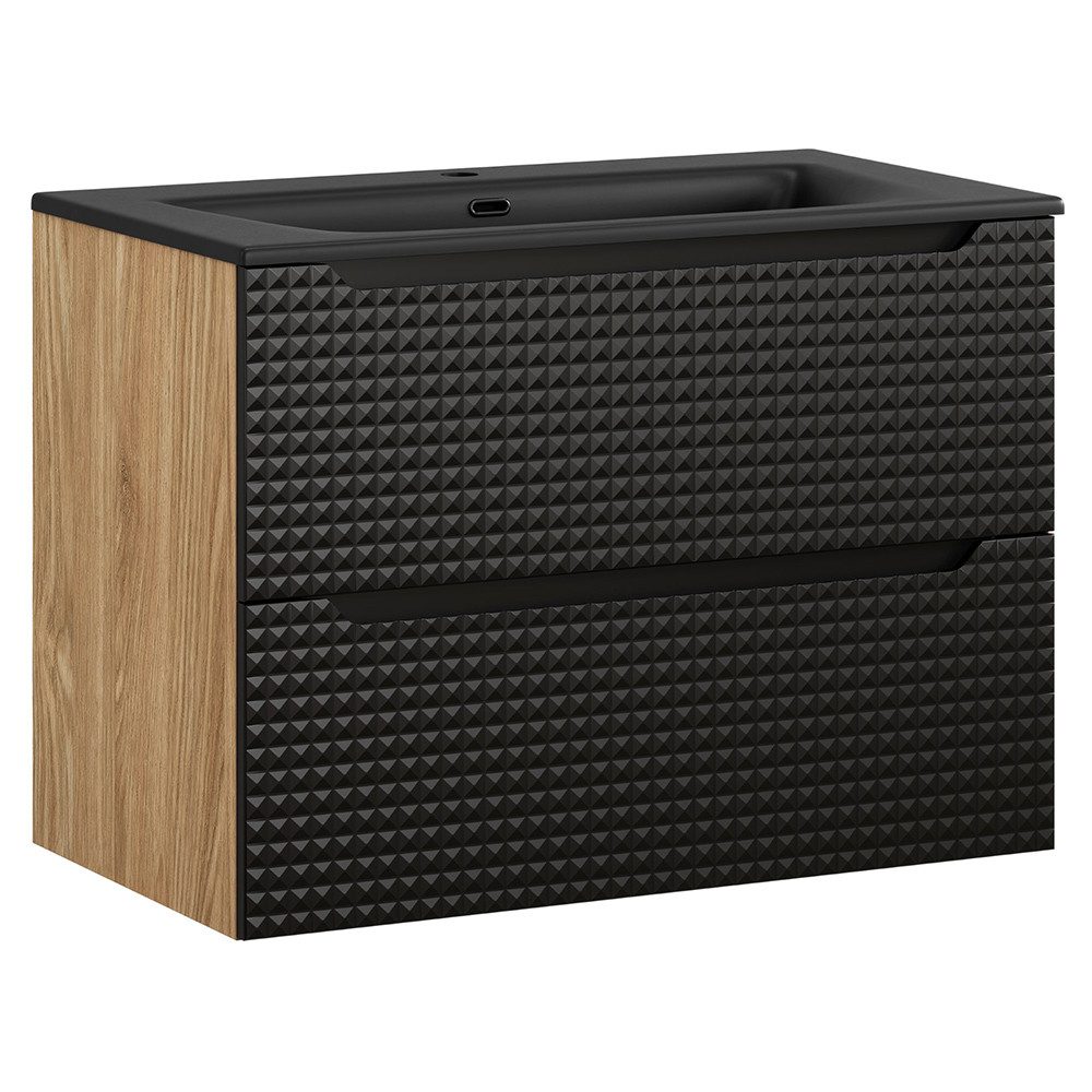 Erlebe unsere elegante Badmöbelserie, die durchdachtes Design und praktischen Komfort in deinem Badezimmer vereint. Die rustikale Eiche kombiniert mit den grifflosen, dunklen Fronten der Schränke schafft einen ansprechenden Kontrast. Всі Elemente sind mit Softclose-Türen und -Schubladen ausgestattet, die für eine leise und sanfte Handhabung sorgen.