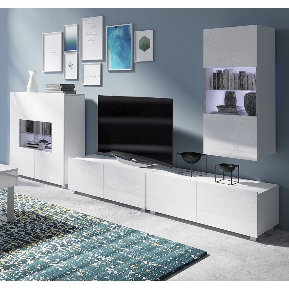 Drei verschiedene Dekore - Eiche Gold Nb., schwarz Hochglanz und weiß Hochglanz - bieten hierbei eine zahllose individuelle Kombinationsmöglichkeiten. Glaselemente und LED-Beleuchtung sorgen dabei für einen modernen Look.