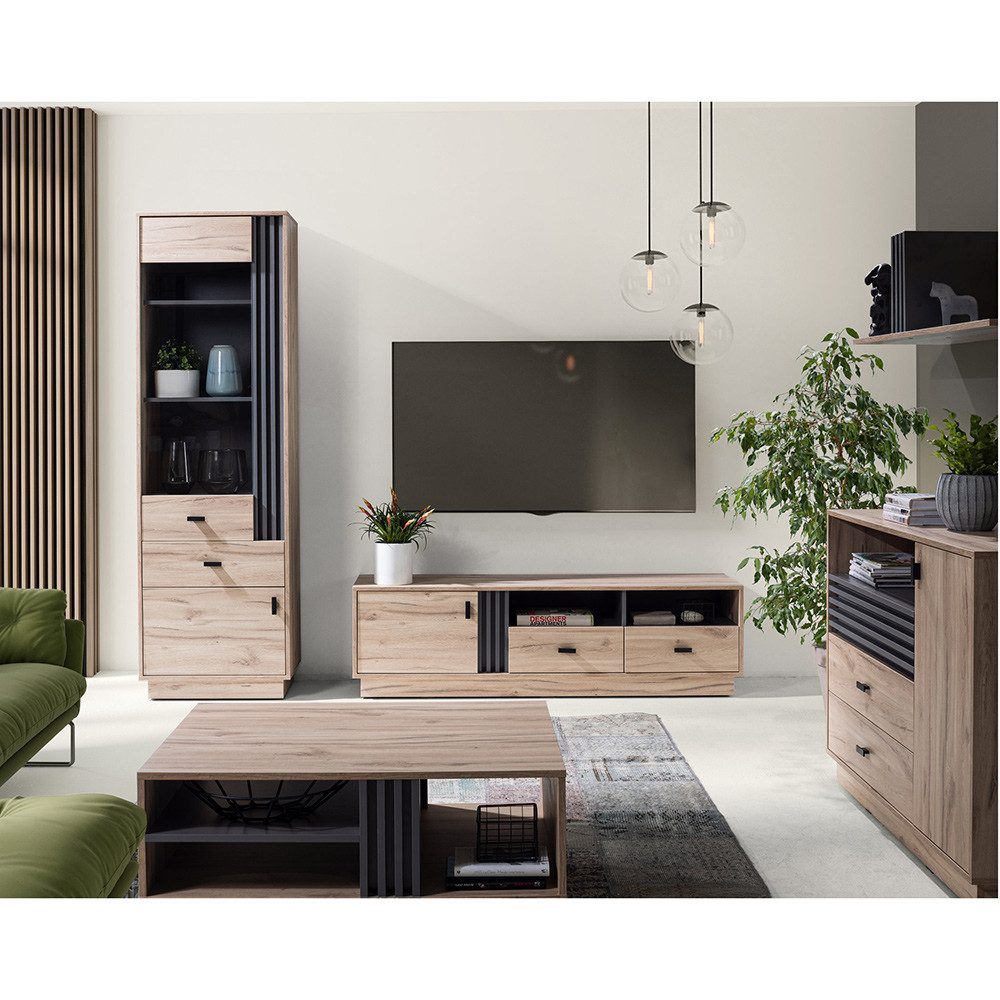 Gemütlich wohnen, stilvoll einrichten – mit diesem 5-teiligen Wohnzimmer-Set wird Dein Wohnzimmer zum Lieblingsplatz. Die warme Eiche-Optik bringt natürliche Ruhe in den Raum, während anthrazitfarbene Akzente für modernen Charakter sorgen. Всіs wirkt harmonisch, durchdacht und absolut wohnlich. Egal ob zum Entspannen, Verstauen oder Dekorieren – hier passt einfach alles zusammen. Mach’s Dir schön – dieses Set wartet auf Dich!