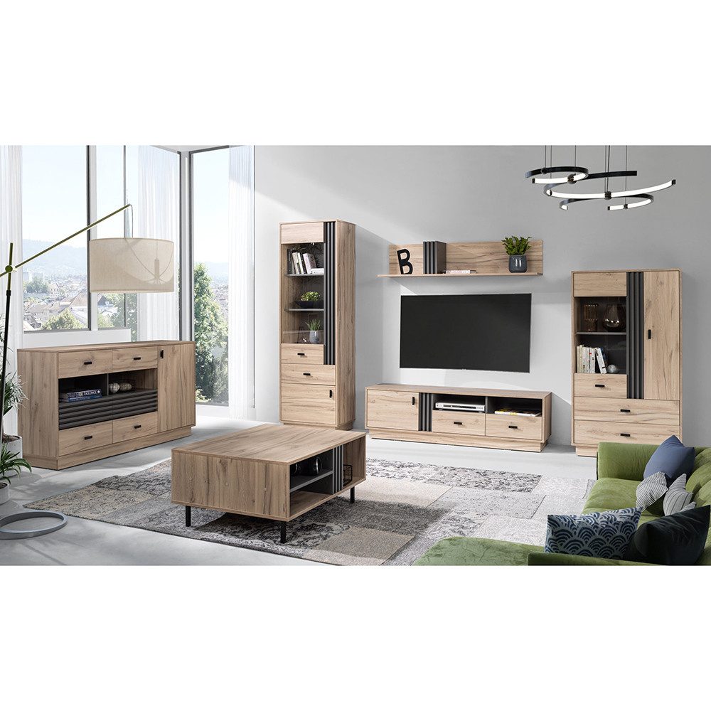 Dieses 6-teilige Wohnzimmer-Set bringt alles mit, was Du für ein rundum stimmiges Zuhause brauchst. Die warme Eiche-Nachbildung schafft eine gemütliche Basis, während anthrazitfarbene Akzente moderne Kontraste setzen. Vitrinen, Lowboard, Couchtisch, Wandboard und Kommode sind perfekt aufeinander abgestimmt – und lassen sich gleichzeitig flexibel nutzen. Viel Platz, durchdachte Details und ein Look, der Eindruck macht.