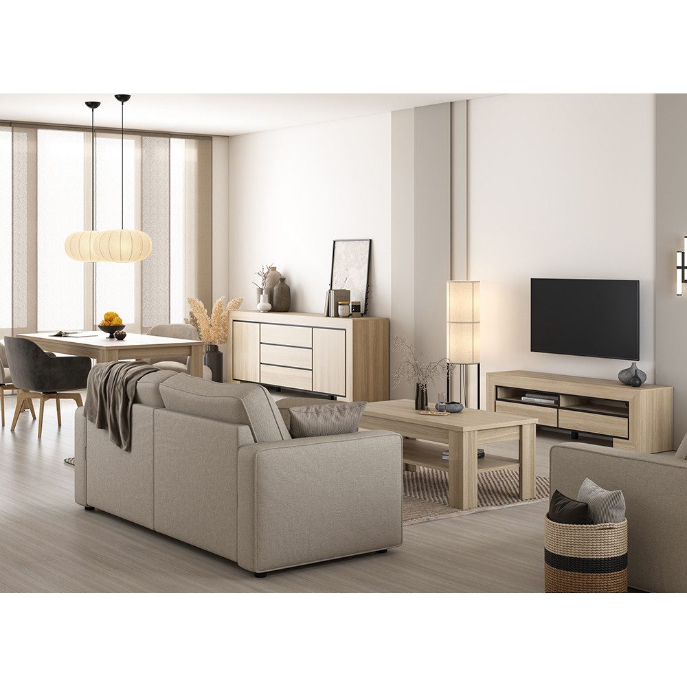 Dieses Wohn- & Esszimmer-Set vereint klares Design mit durchdachter Funktionalität. Das warme Eiche-Dekor bringt eine einladende Atmosphäre in den Raum, während schwarze Akzentlinien moderne Akzente setzen. Das Sideboard bietet großzügigen Stauraum, das Lowboard sorgt mit offenen Fächern und Kabeldurchlass für Ordnung bei Technik, und Esstisch sowie Couchtisch schaffen perfekte Plätze für gesellige Momente. Grifflose Fronten mit abgeschrägter Kante und Softclose-Technik machen die Bedienung angenehm leise und komfortabel.